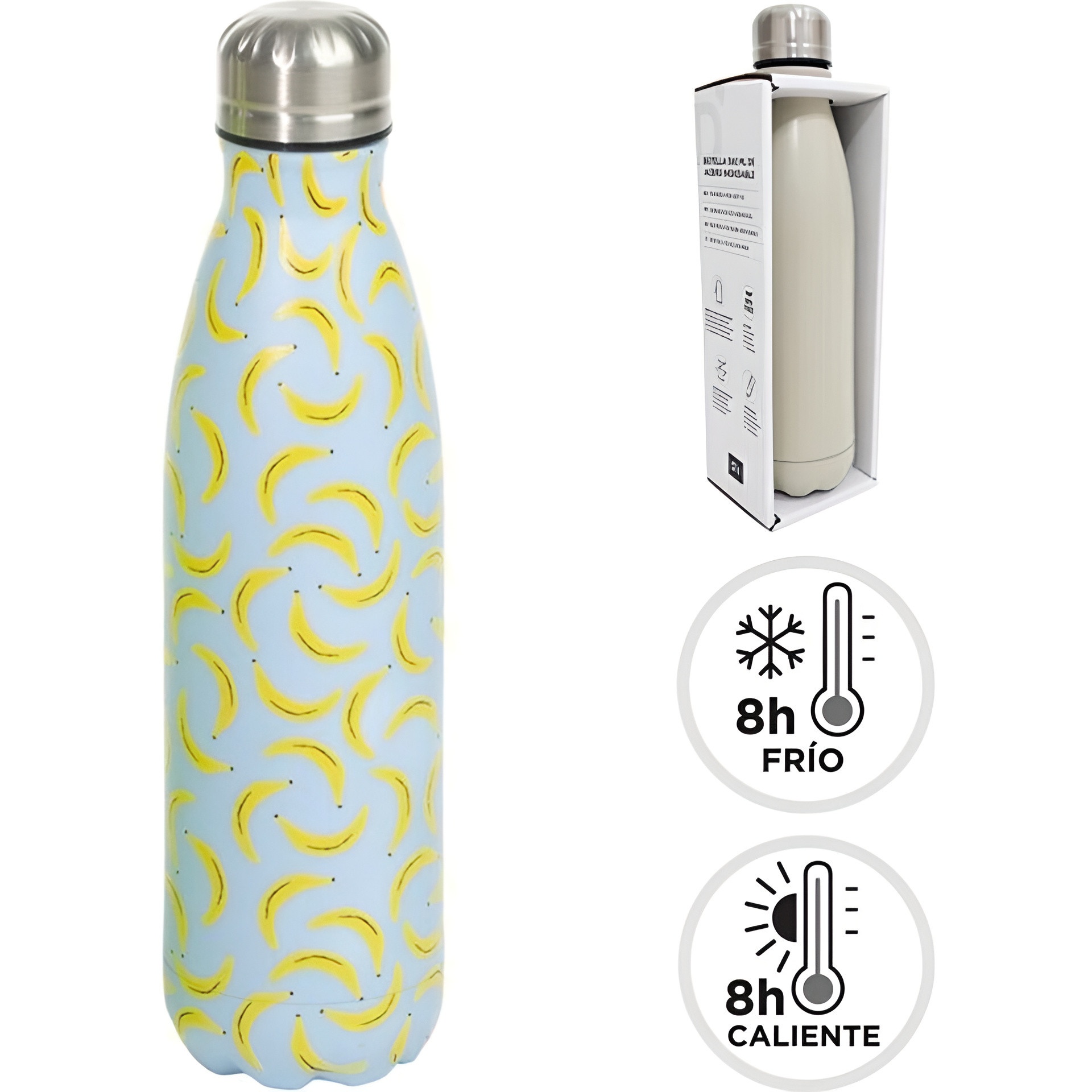 Doppelwandige Thermoflasche, entwickelt, um Ihre Getränke länger auf der idealen Temperatur zu halten. Das Bananenmuster verleiht ihr eine fröhliche, sommerliche Note, die überall auffällt, wo Sie sie hin mitnehmen. Ergonomisches Design und sicherer Verschluss verhindern Verschütten und erleichtern den Transport. Ideal für den Alltag, die Arbeit, den Sport oder Ausflüge ins Freie.