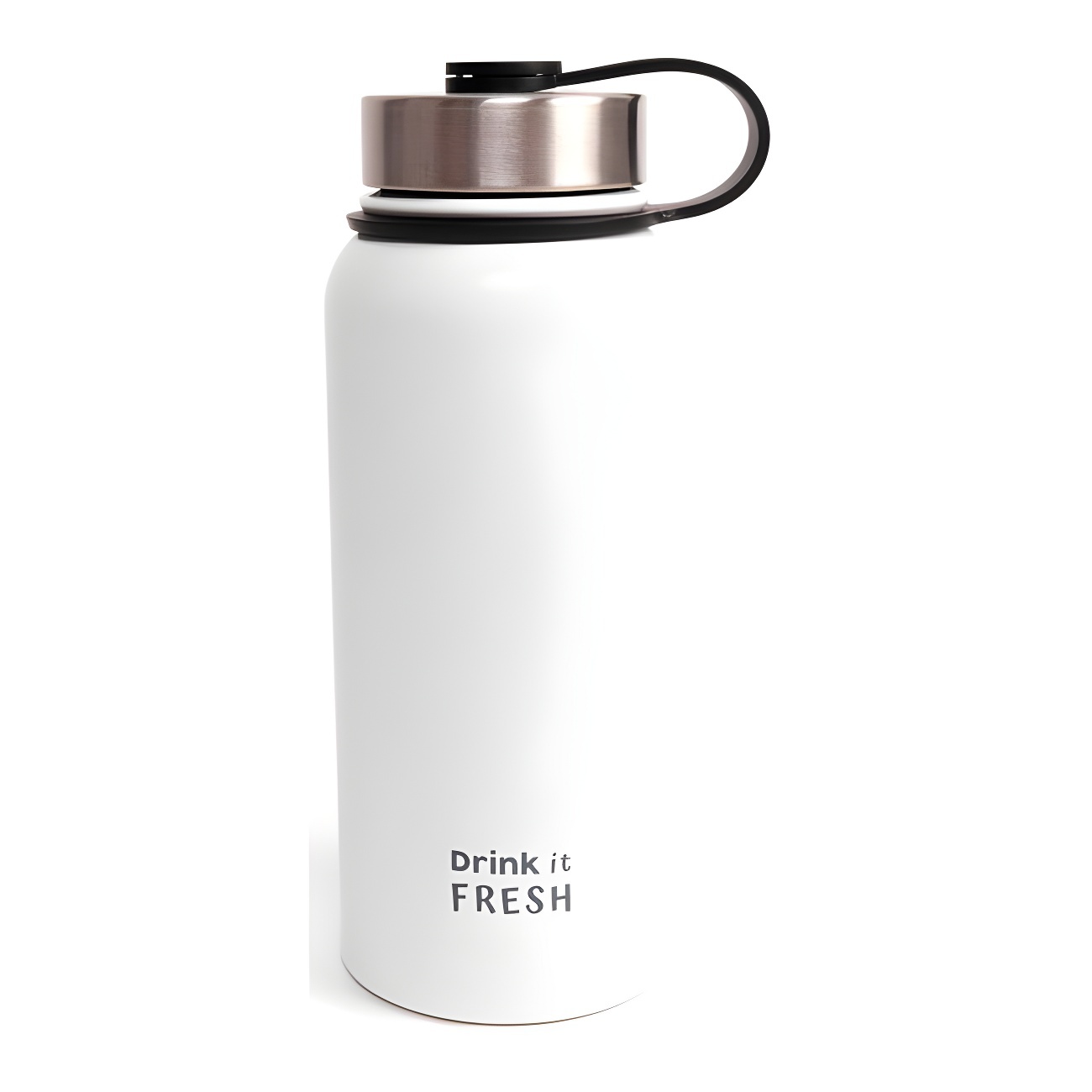 - Schraubverschluss, der mit einem Kunststoffband an der Flasche befestigt ist