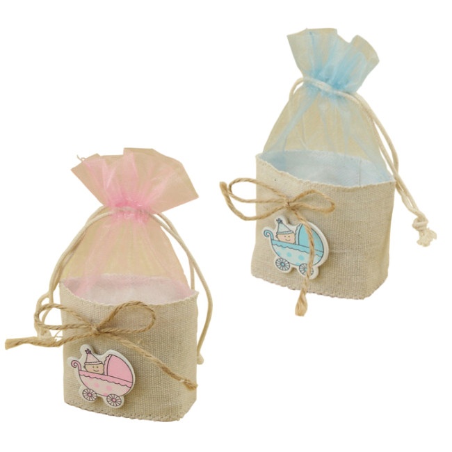 Dieses Produkt besteht aus einem hessischen Beutel mit einer Schleife aus Espartogarn, einem inneren Tüllbeutel und einem Ornament in Form eines Kinderwagens.
