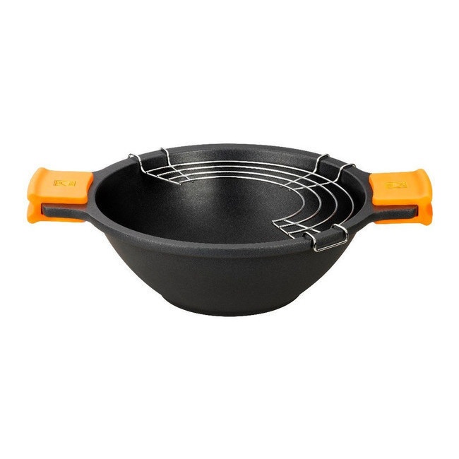 - Inklusive Deckel, orangefarbenen Silikongriffen und Dämpfeinsatz