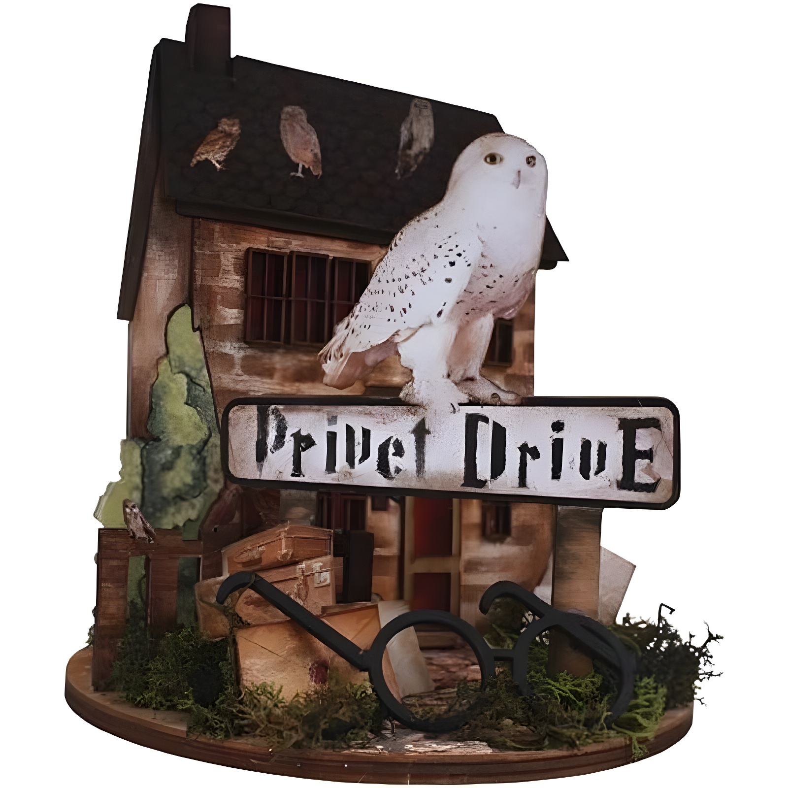 - Maße: Haus 18 x 14,7 cm; Schild mit Eule 26 x 19,6 cm; Zaun mit Eulen 6,8 x 5,4 cm.