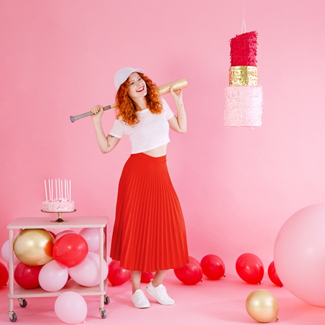 Piñata in Form eines Lippenstifts in rosa, gold und rot.