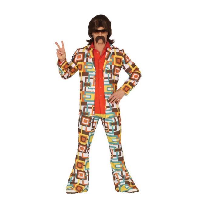 Bestehend aus einem Anzug im Stil der 70er Jahre mit Jacke und Hose, hat dieses Set ein Muster aus verschiedenen Größen und Farben in Quadratform, sehr repräsentativ für diese Epoche.