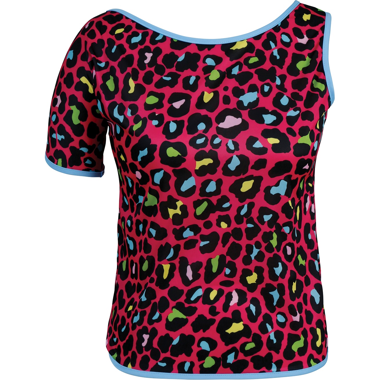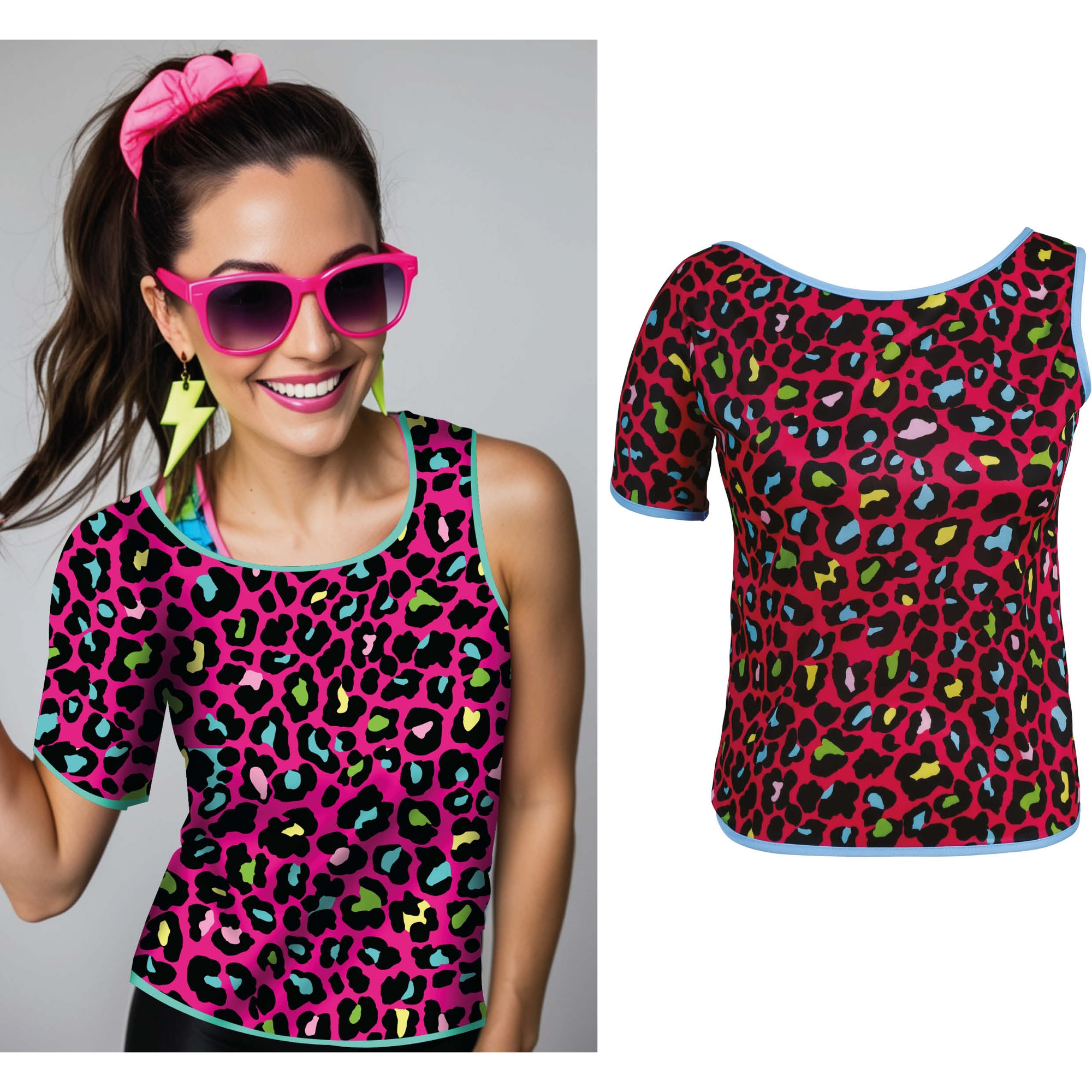 Dieses vom 80er-Jahre-Stil inspirierte T-Shirt mit neonfarbenem Leopardenmuster zieht alle Blicke auf sich. Der bequeme Kurzarmschnitt ist ideal für Erwachsene, die einen verspielten, retro-inspirierten Look suchen. Der leichte Polyesterstoff sorgt für Tragekomfort und einen vorteilhaften Fall. Kombinieren Sie es mit Neon-Accessoires, Leggings oder Vintage-Röcken für ein auffälliges Party-Outfit. Bringen Sie Ihre Feier mit einem farbenfrohen 80er-Touch zum Leben.