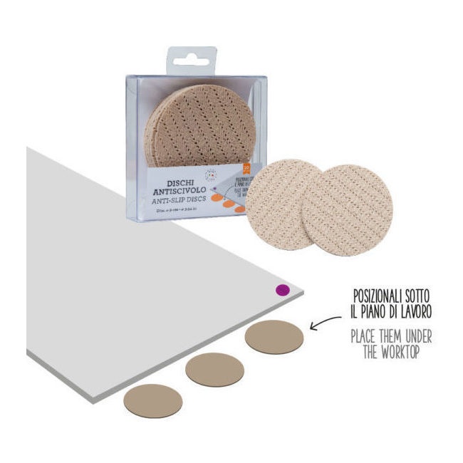 Praktische Scheiben, die zwischen Arbeitsfläche und Tischplatte gelegt werden, um zu verhindern, dass die Unterlage während des Gebrauchs auf dem Tisch rutscht.