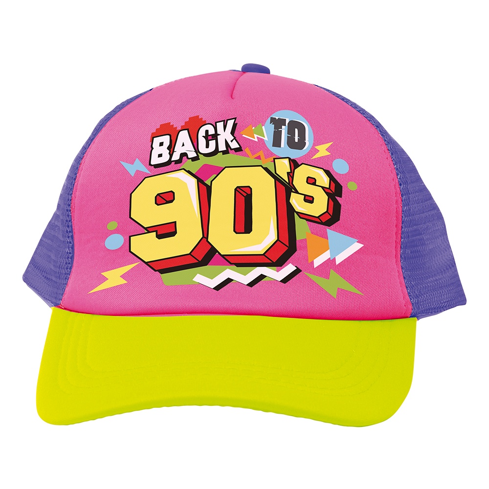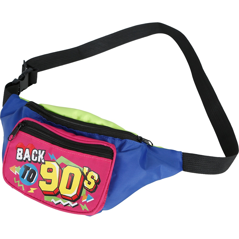 - Retro-Cap und Bauchtasche im 'Back to 90's'-Design mit neonfarbenen Akzenten, die auf der Tanzfläche auffallen.