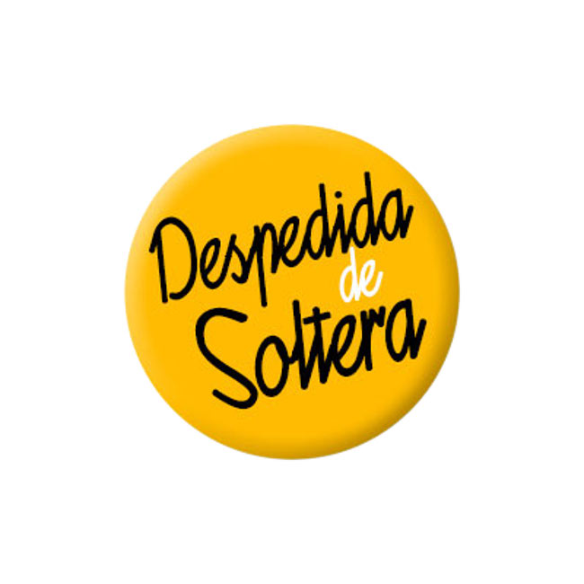 Dieser runde Anstecker zeichnet sich durch seine Farbe und den Schriftzug "Bachelorette Party" in schwarzer, verspielter Typografie aus. Die Präposition 'de' erscheint in Weiß.