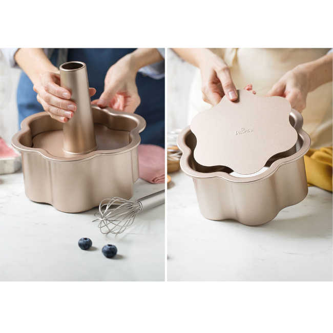 Eine hochwertige Form aus antihaftbeschichtetem Material, mit der Sie süße und herzhafte Leckereien herstellen können. Es handelt sich um eine Form, die zwei verschiedene Verwendungsmöglichkeiten bietet: einen flachen Boden und einen weiteren Boden mit einer Röhre in der Mitte.