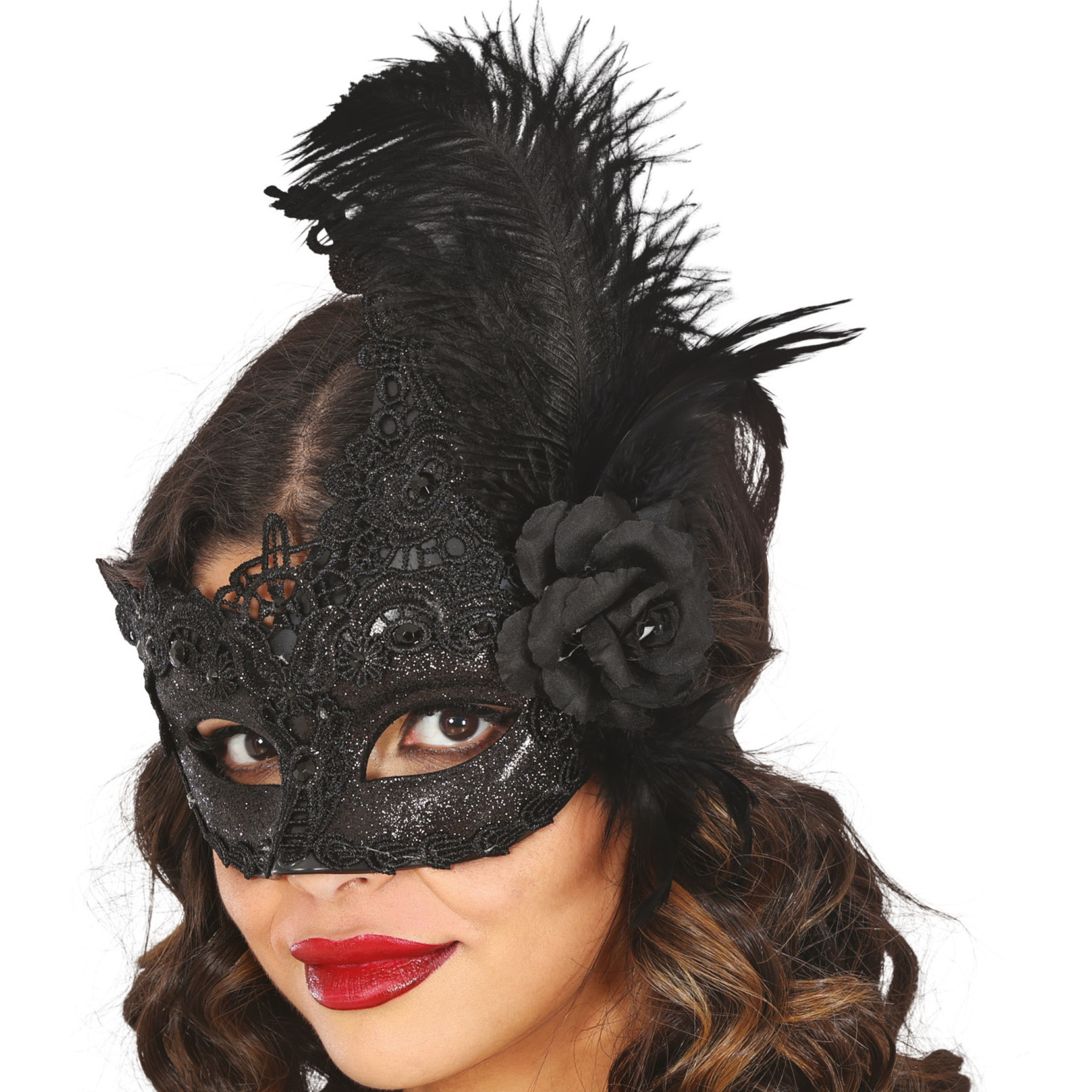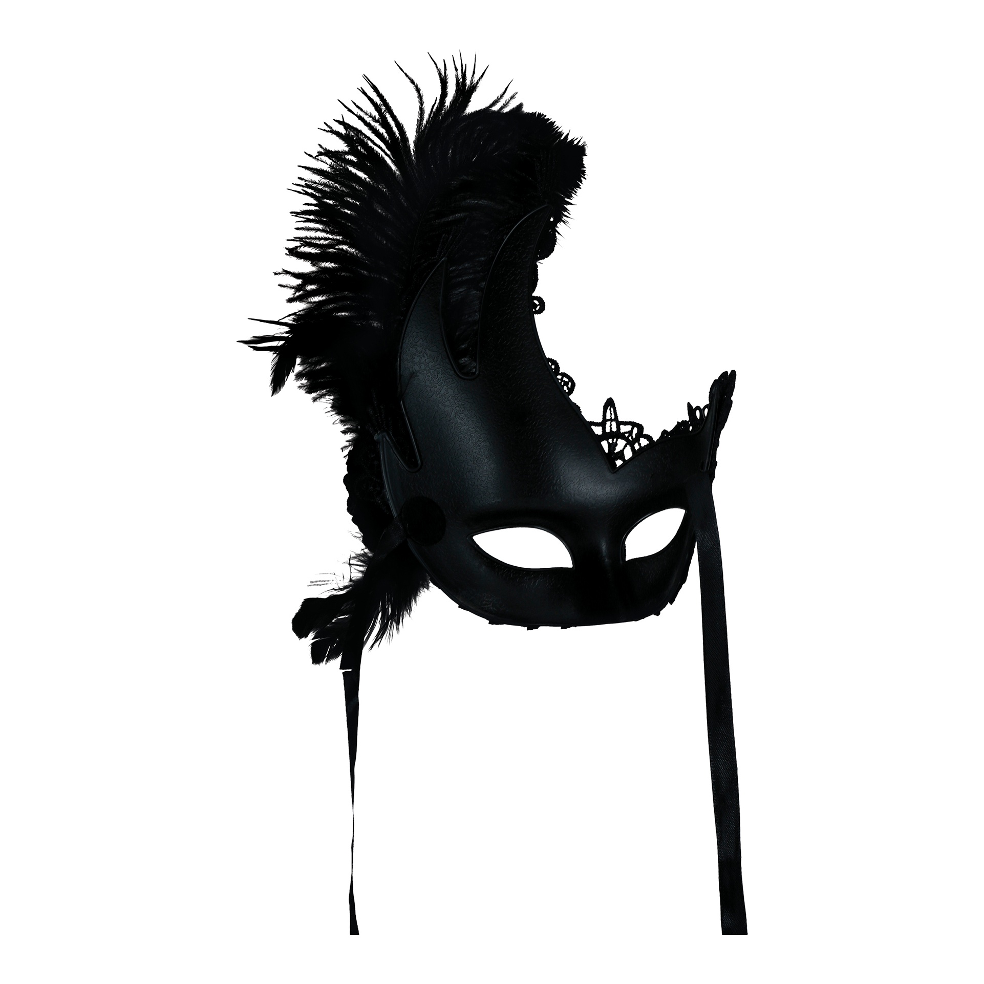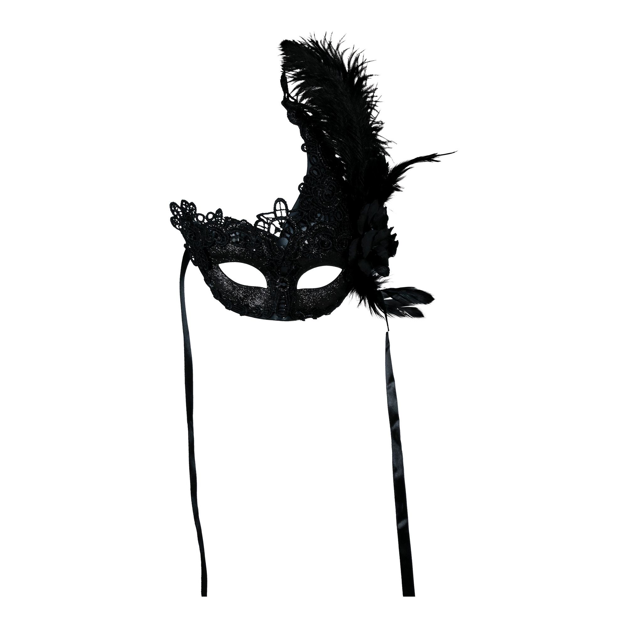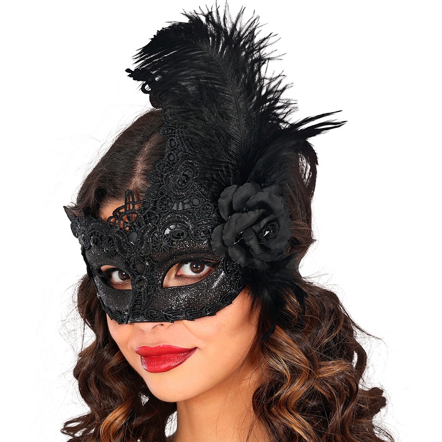 Augenmaske mit schwarzer Spitze und Federn