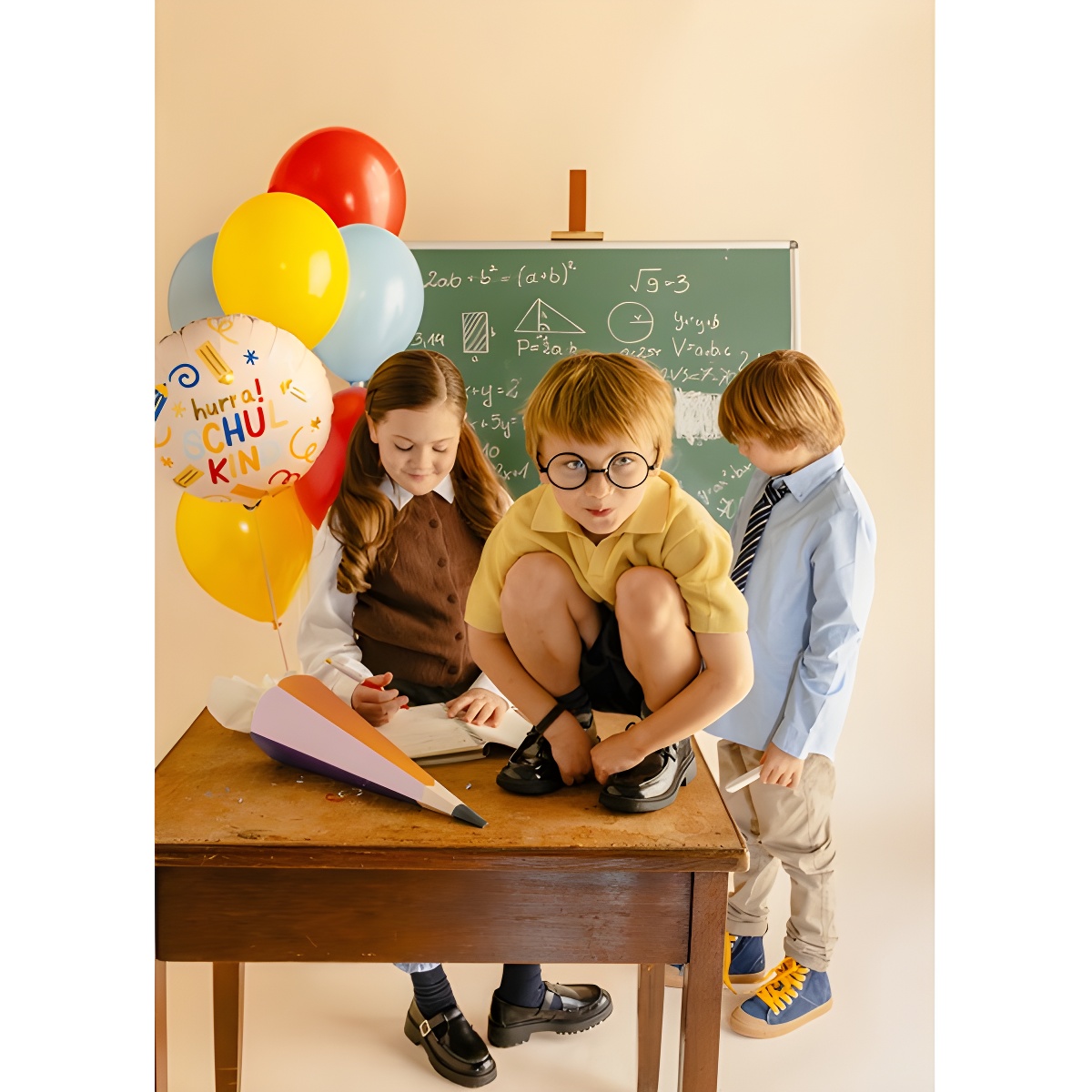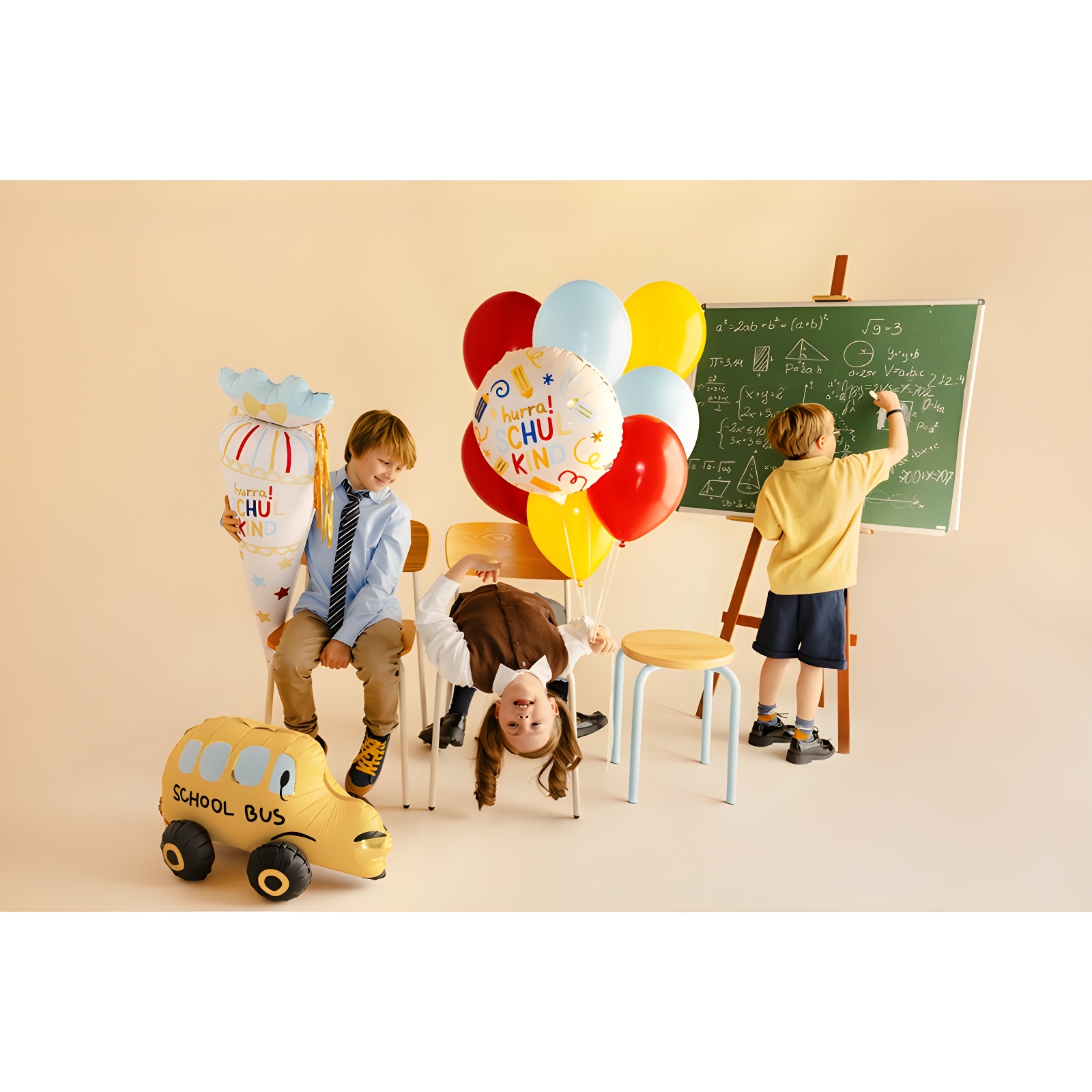Dekorativer Ballon mit dem Schriftzug Hurra Schulkind und schulischen Motiven in Creme- und kräftigen Farben. Das fröhliche Design verleiht Ihrer Schulanfangsfeier einen festlichen Akzent.