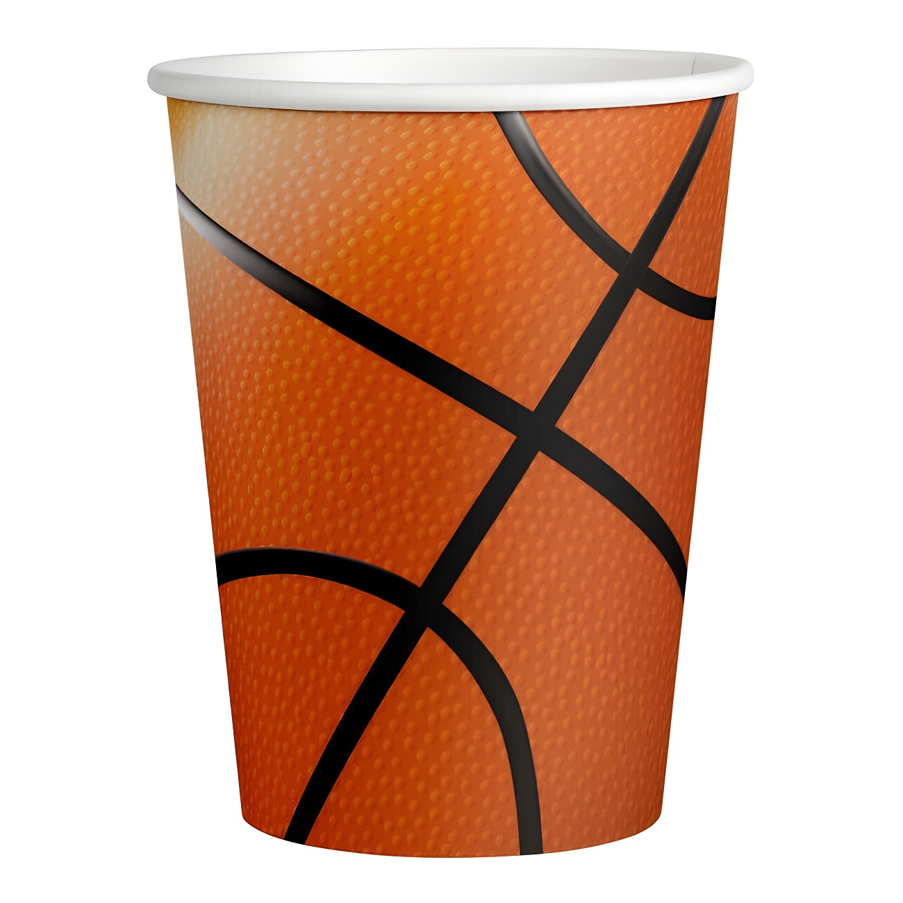 Laminierte Pappbecher in 8er-Packungen. Auf einem hellbraunen Hintergrund sehen wir die Zeichnung eines Basketballs.