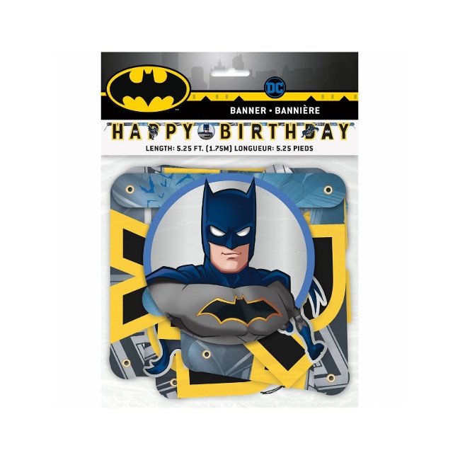 Diese dekorative Batman-Girlande enthält den Schriftzug "Happy Birthday" in englischer Sprache und eignet sich hervorragend als Dekoration für jede Geburtstagsparty mit Batman-Motiven.