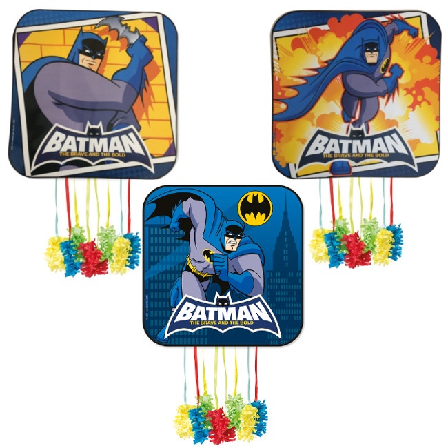 Unglaubliche Batman-Piñata mit Riemen oben zum Aufhängen von der Decke und Riemen unten zum Ziehen, um die Piñata zu öffnen.