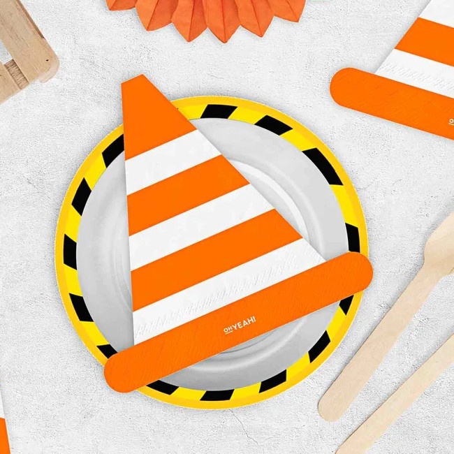 Eine Packung mit kleinen Tellern, die Sie für die Tischdekoration auf Ihrer Baustellenparty verwenden können.