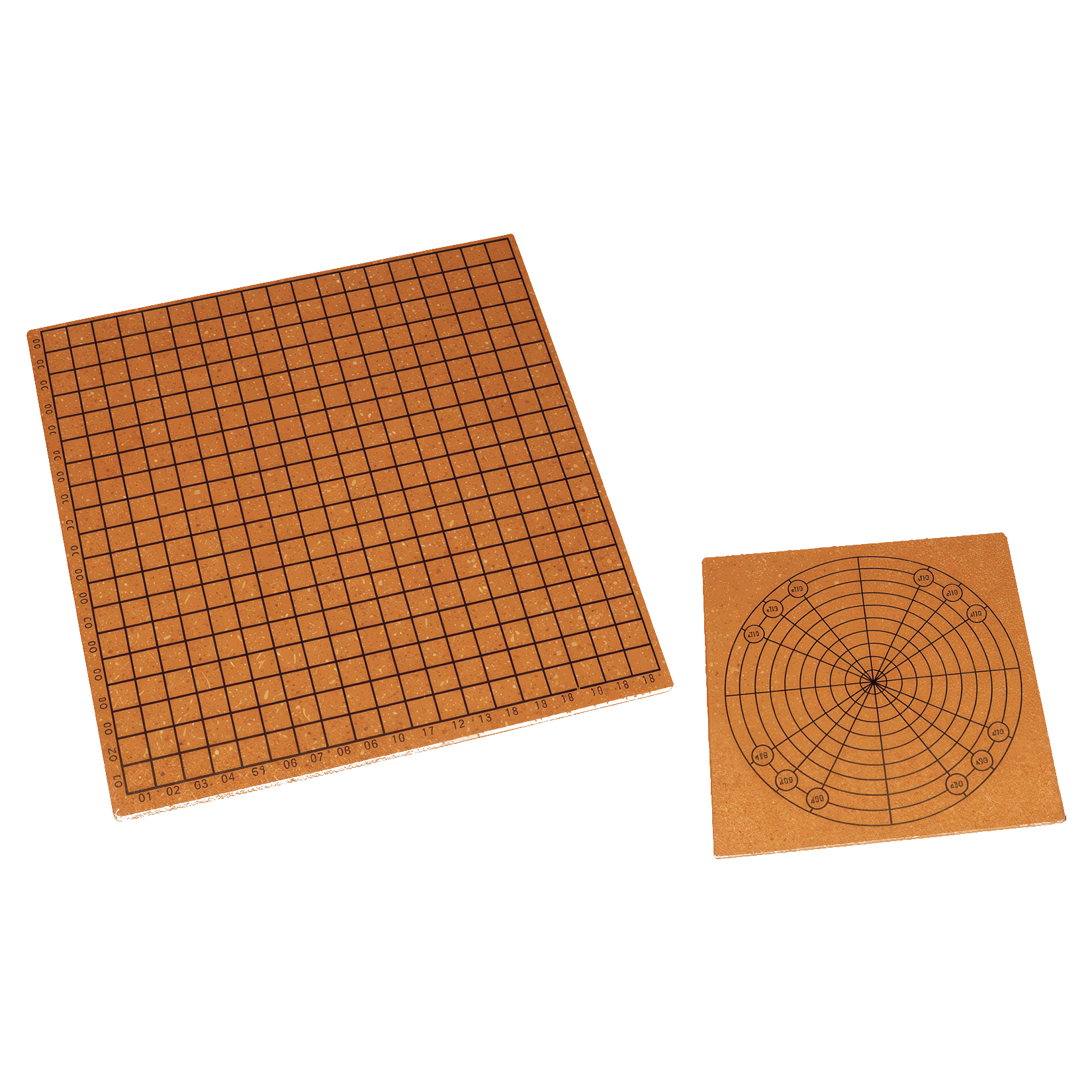 - Es besteht aus einer beidseitig verwendbaren Platte: auf der einen Seite ein quadratisches Raster, auf der anderen ein kreisförmiges Raster mit konzentrischen Ringen.
