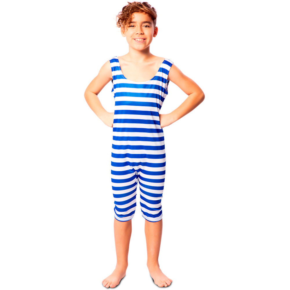Dieses lustige, blau-weiß gestreifte Badekostüm im Retro?Stil der 1920er Jahre, angelehnt an historische Herren-Badeanzüge, ist eine originelle Wahl für Ihre nächste Sommerparty.