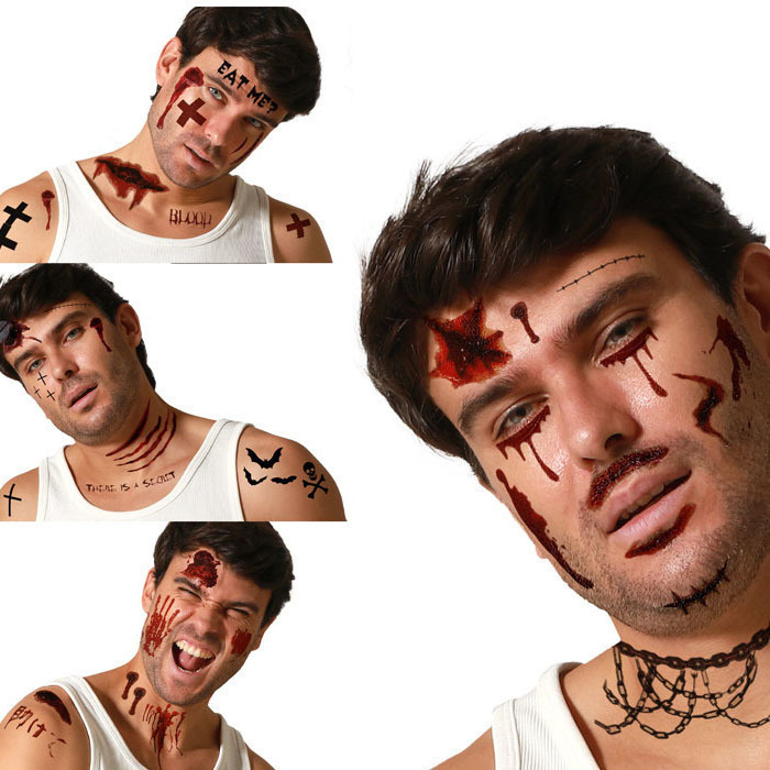 • Set von temporären Tattoos, die blutige Schnitte, Stiche und Kratzer umfassen. Ideal für Monster- oder Horroropfer-Kostüme. Es gibt 4 mögliche Designs.