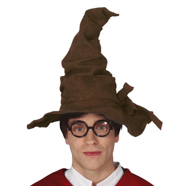 Brauner Zauberer- oder Hexenhut aus Stoff mit zerknitterter Optik, der an den Harry Potter-Sortierhut erinnert. Dieses Accessoire kann mit jedem Zauberer- oder Hexenkostüm kombiniert werden.
