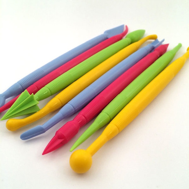 Dieses Produkt enthält 8 Modellierwerkzeuge aus lebensmittelechtem Kunststoff: Ein blauer Tortenheber mit Muschel- und Klingenende, ein roter Tortenheber mit gebogenem Ende und zylindrischem Ende, ein grüner Tortenheber mit spitzem Ende und gestreiftem Kegelende, ein gelber Tortenheber mit unterschiedlich großen Kugelenden, ein blauer Tortenheber mit Spatelende und gebogenem Kantenende, ein roter Tortenheber mit spitzem Ende, ein grüner Tortenheber mit spitzem Ende und ein gelber Tortenheber mit gebogenem, spitzen Ende.