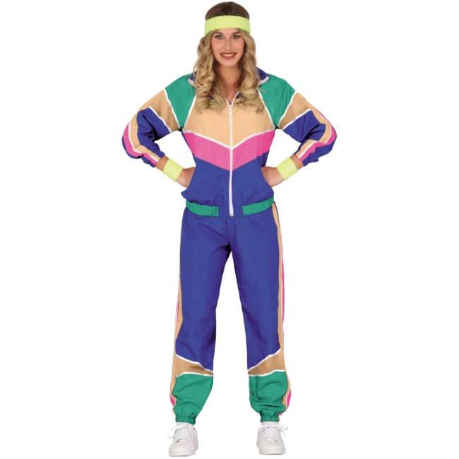Buntes 80er-Jahre-Turnkostüm für Frauen.