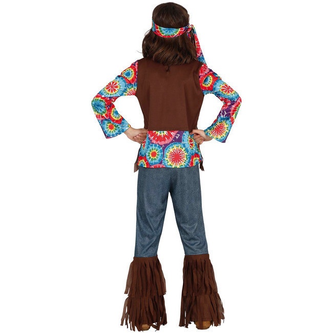 Das Langarmshirt hat ein Stück braunen Stoff mit Fransen wie eine Weste angenäht. Das Stirnband ist ein Stoffstreifen im gleichen Design wie das Shirt und wird hinten mit Klettverschluss geschlossen. Die Hose hat am Saum braune Fransen.