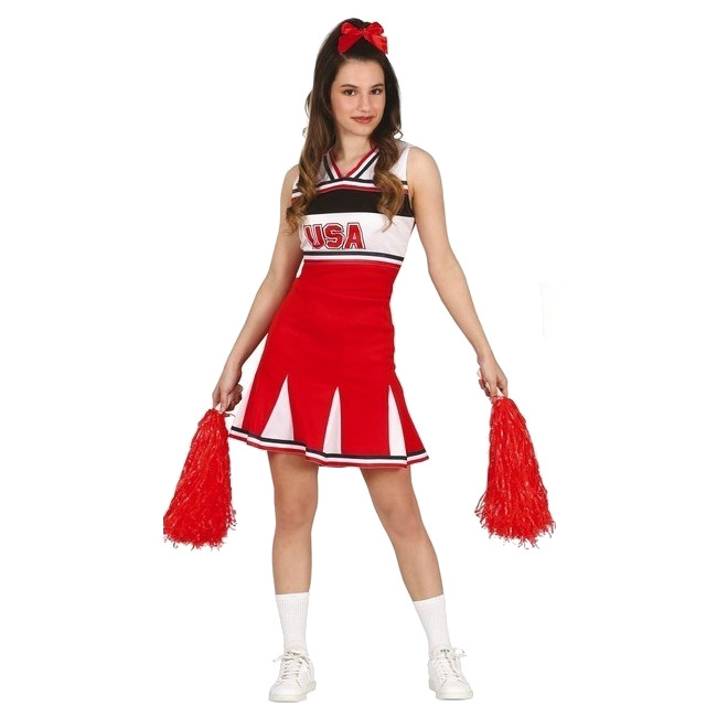 Dieses amerikanische Cheerleader-Kostüm für Mädchen besteht aus einem Kleid in einer Kombination aus Schwarz, Weiß und Rot. Der Rock hat die für diese Kostüme so charakteristische Faltenform.