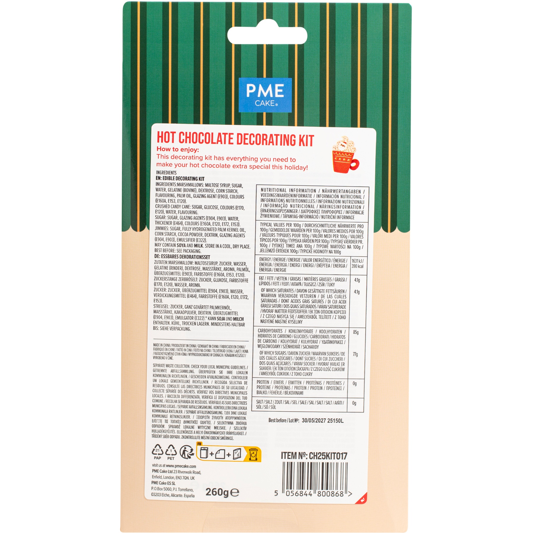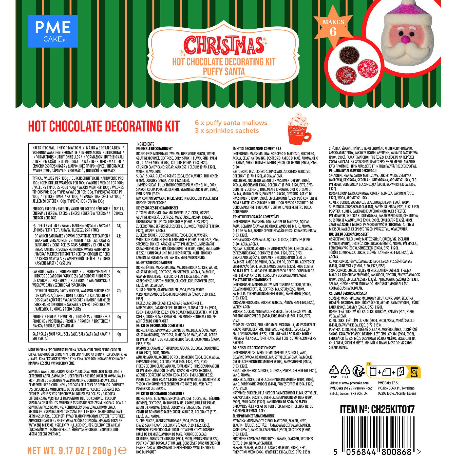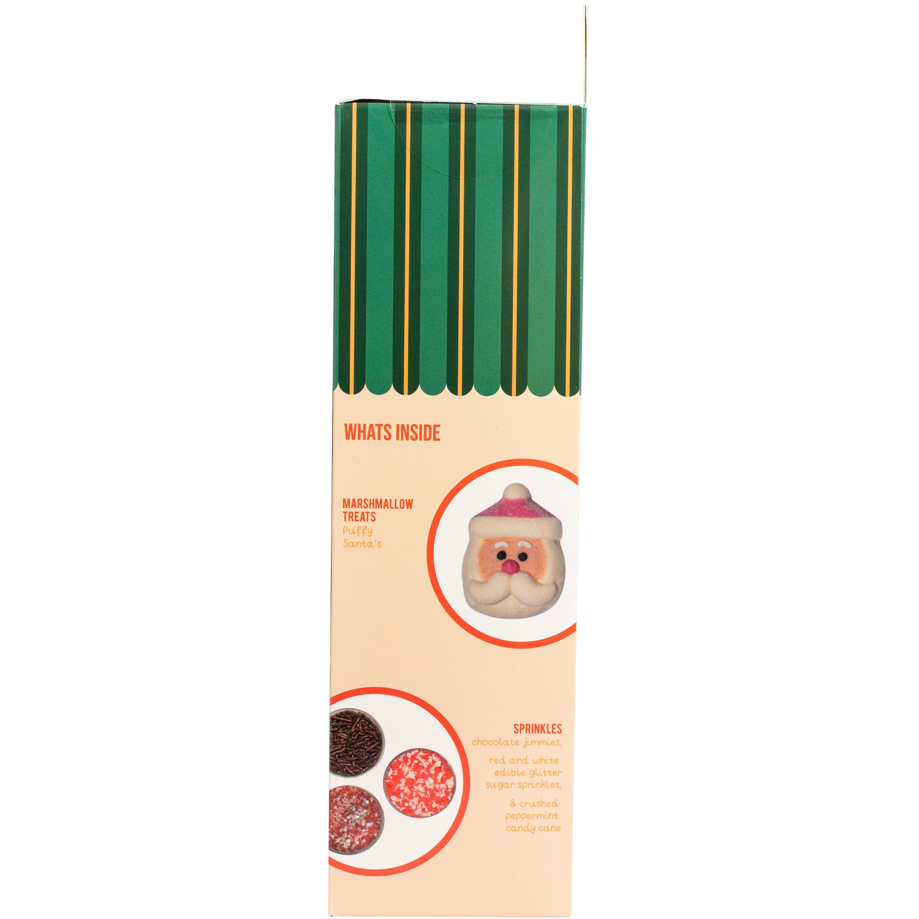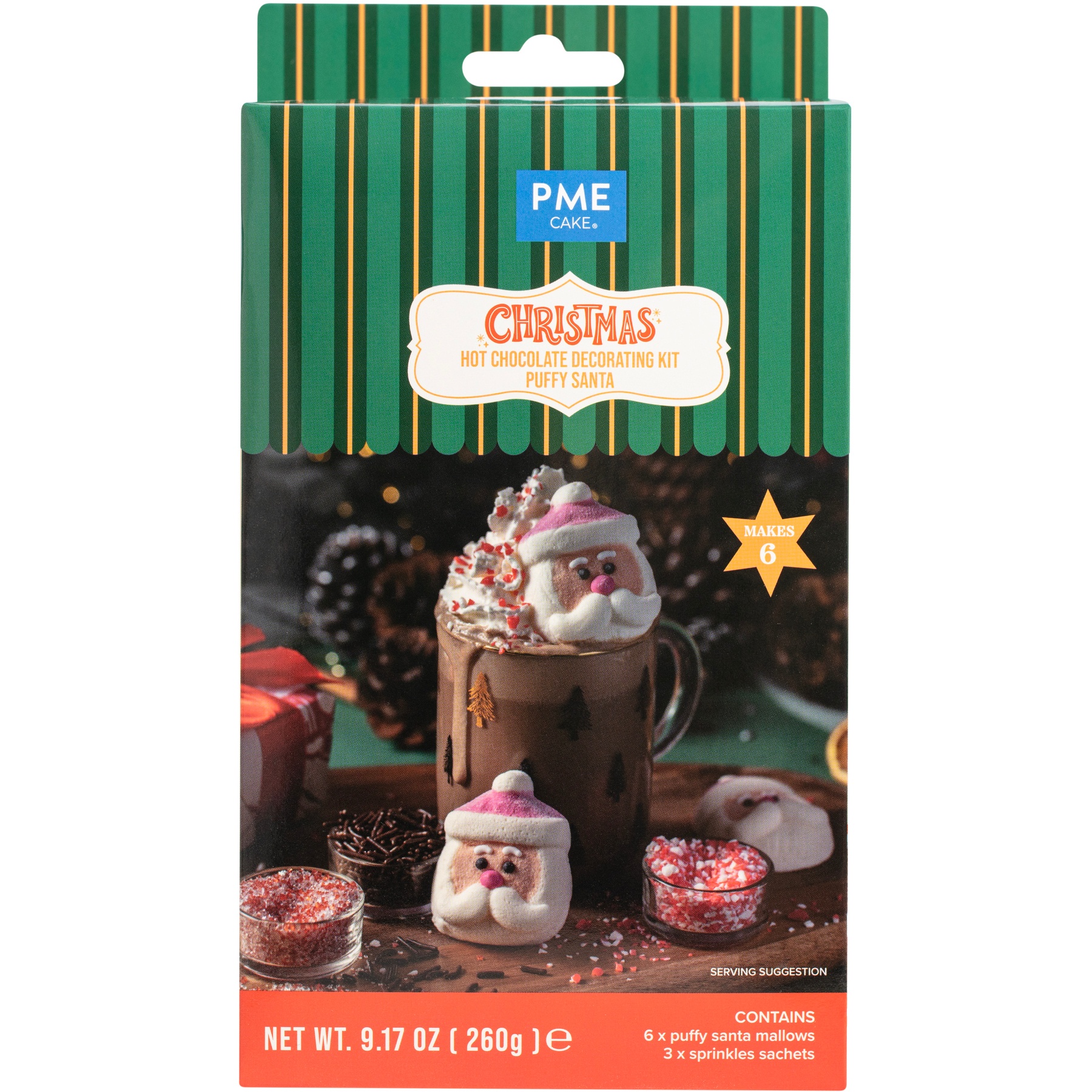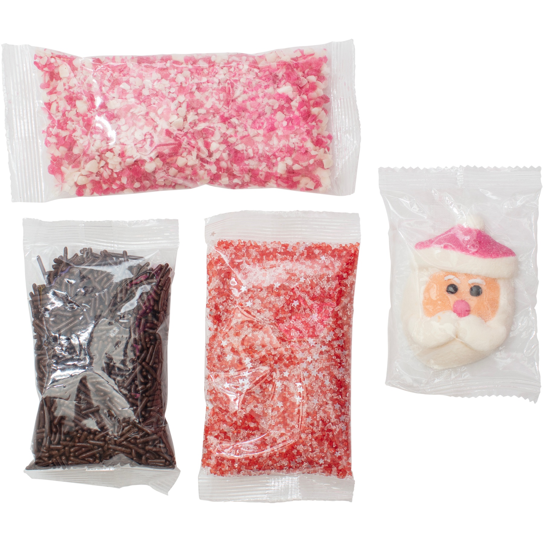 - Enthält 6 Weihnachtsmann-Marshmallows und 3 Tütchen mit Streuseln (Schokostreusel, zerdrückter Zuckerstangen und Zucker).