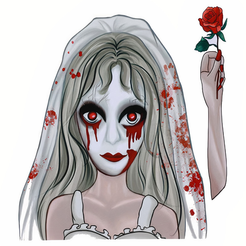• Dekorative Klebefolie mit dem Motiv einer Zombie-Braut mit blutverschmiertem Schleier und roter Rose. Ideal für Fenster oder Spiegel.