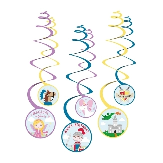 Diese spiralförmigen Anhänger sind einfach zauberhaft. Sie sind von dem tapferen Ritter verziert, der auszog, um die schöne Prinzessin zu retten. Ideal für Mottopartys oder Kinderfeste. Sie sind leicht aufzuhängen und wieder abzunehmen.