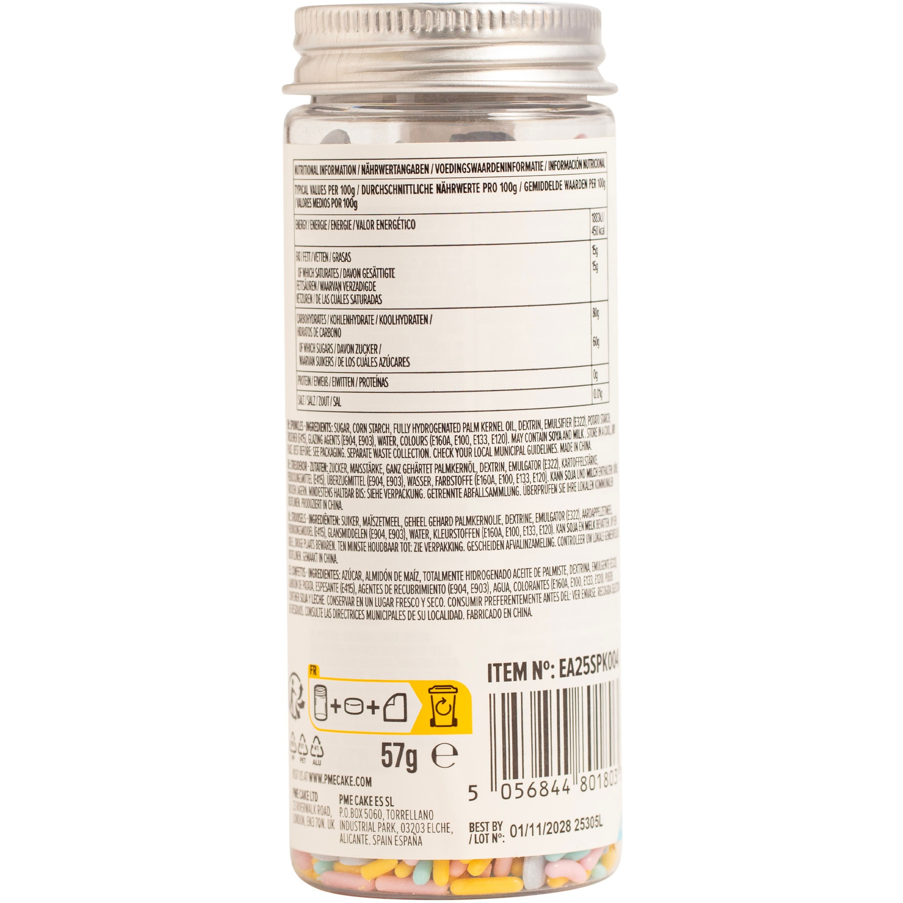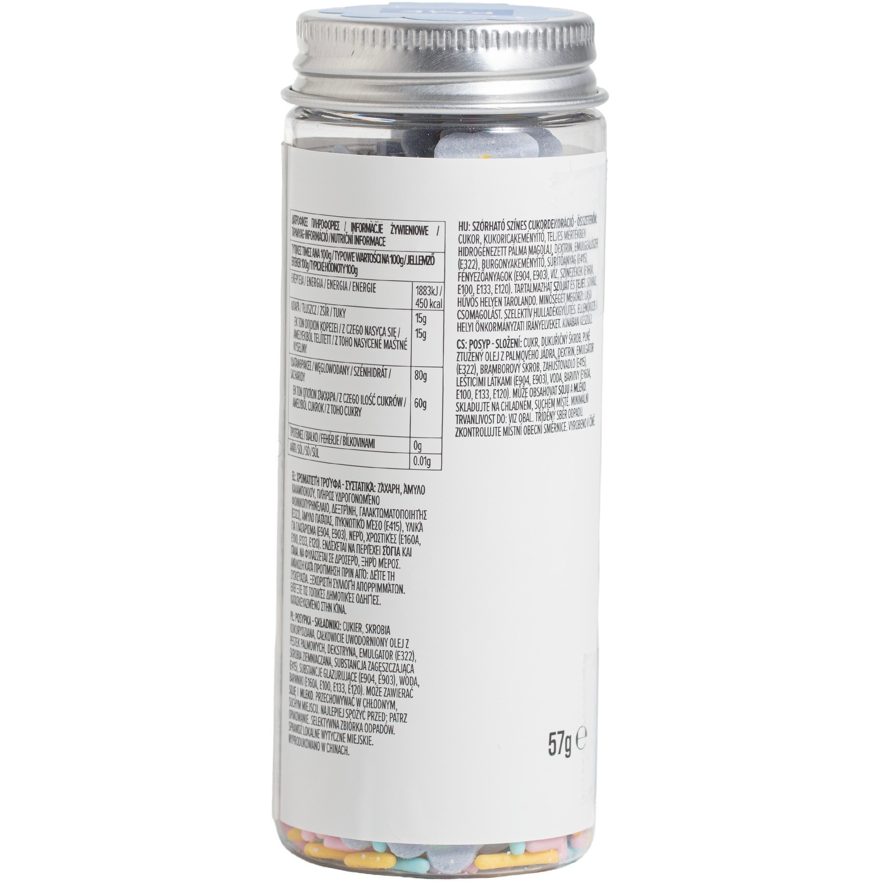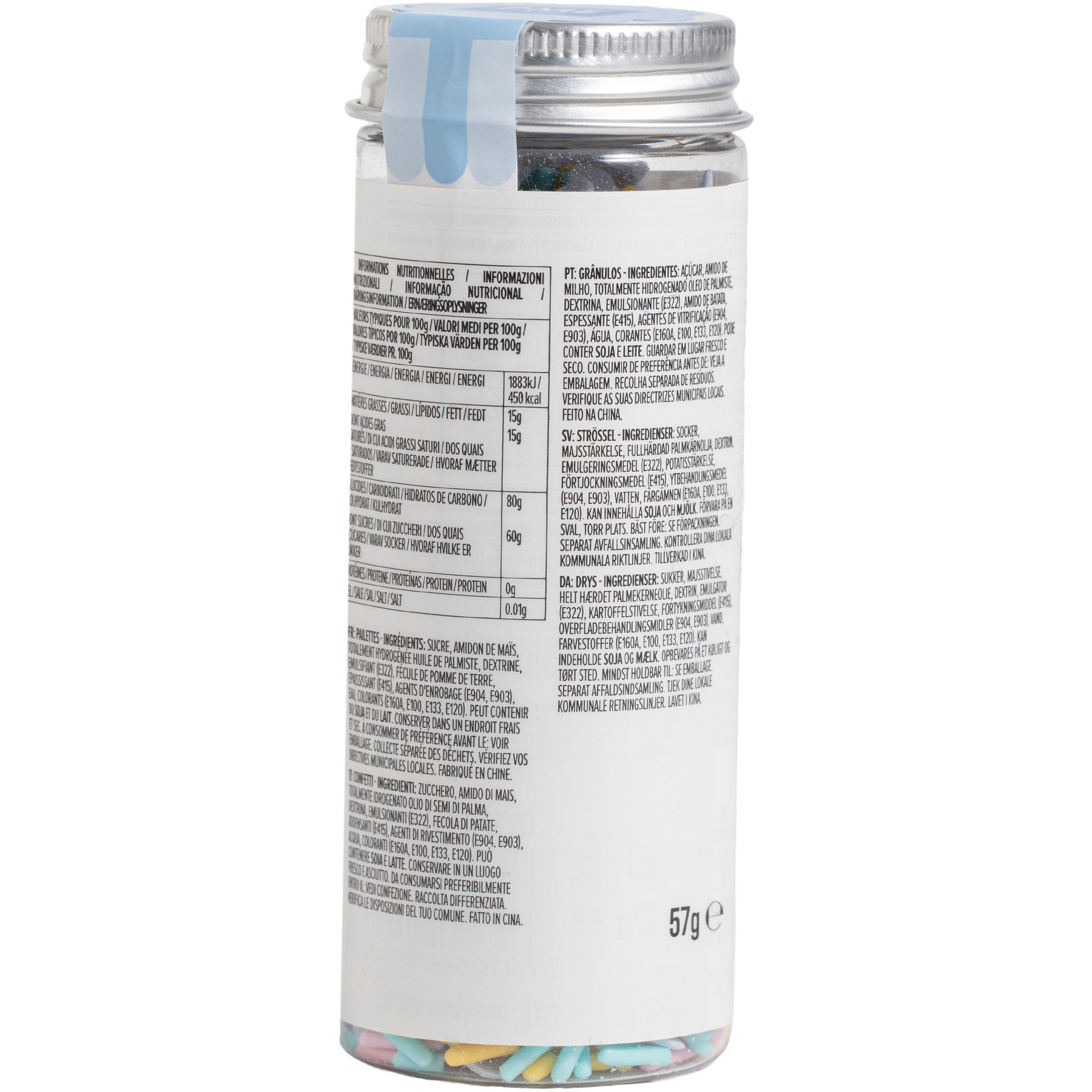Zutaten: Zucker, Maisstärke, vollständig gehärtetes Palmkernöl, Dextrin, Emulgator (E322), Kartoffelstärke, Verdickungsmittel (E415), Überzugsmittel (E904, E903), Wasser, Farbstoffe (E160A, E100, E133, E120).