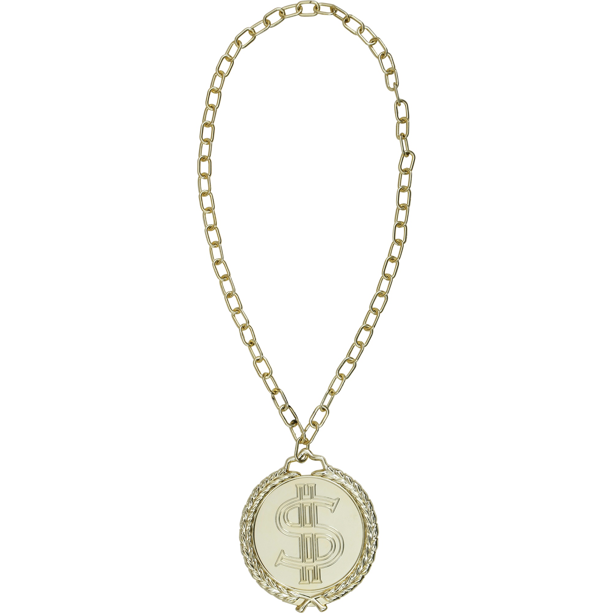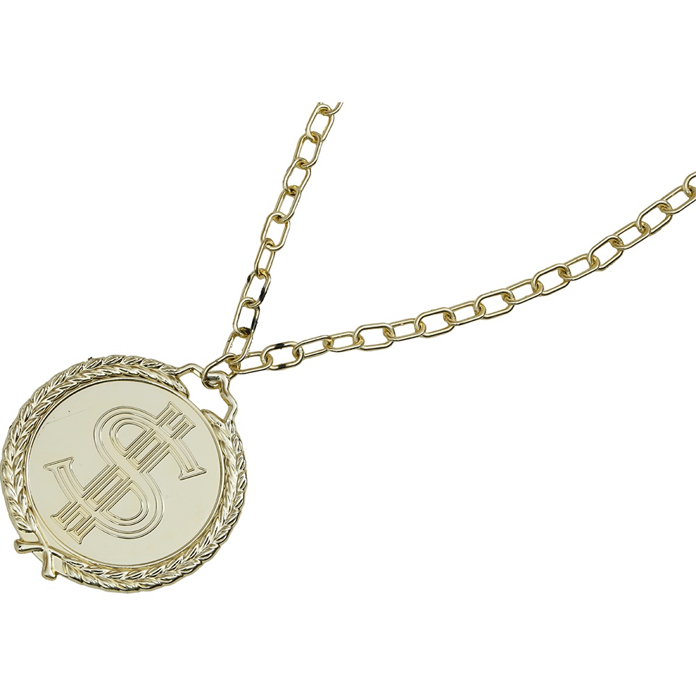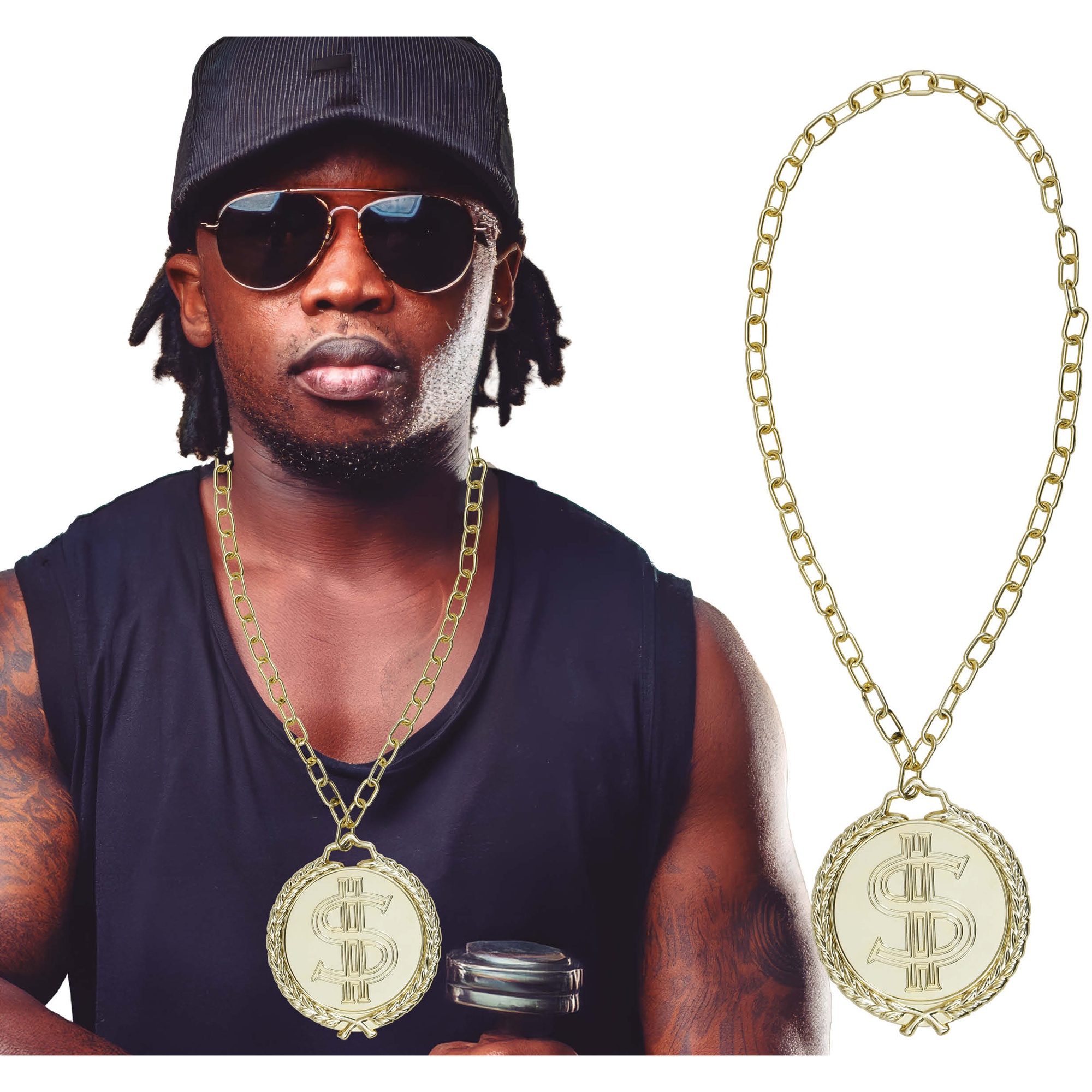 - Große Medaille mit Dollar-Symbol, die Ihrem auffälligen Rapper-Look Präsenz verleiht.