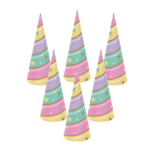 Eine Tüte, die 8 kleine Papphüte in Kegelform enthält, die zusätzlich ein Einhornhorn simulieren.