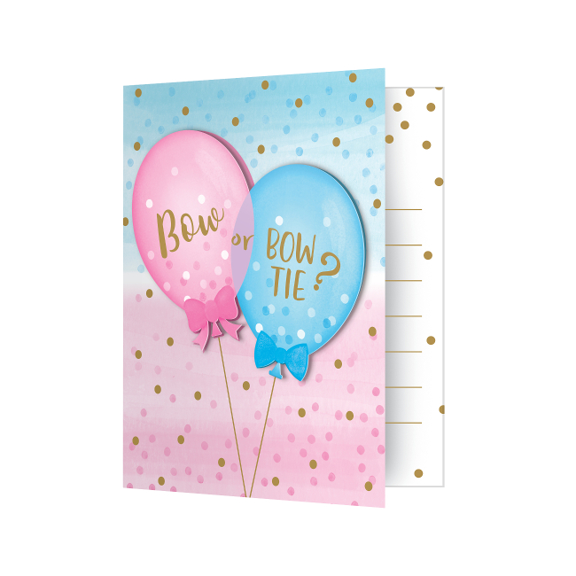 Diese 8 Einladungen zeichnen sich durch das Design auf der Vorderseite aus, das zwei rosafarbene und blaue Luftballons zeigt, die sich den kalligrafischen Schriftzug "Schleife oder Fliege?" auf einem Hintergrund mit Farbverlauf und goldenen Konfetti-Verzierungen teilen. Auf der Innenseite jeder Einladung ist Platz für detaillierte Informationen zur Party.