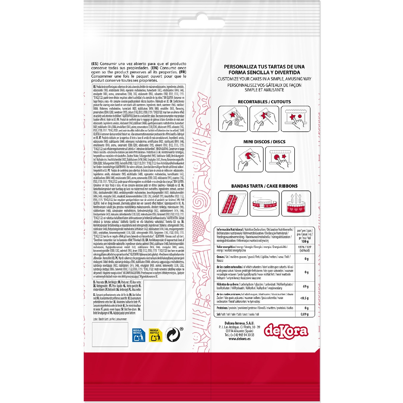 Zutaten: Stärke, Süßungsmittel: E965, Stabilisator: E406i, Verdickungsmittel: Maltodextrin, Feuchthaltemittel: E422, Stabilisatoren: E414, E466, Emulgator: E433, Aroma/Geschmacksstoff, Konservierungsstoffe: E330, E202, Süßungsmittel: E955, Farbstoffe: E102, E122, E133, E151. Die Farbstoffe E102 und E122 können die Aktivität und Aufmerksamkeit von Kindern beeinträchtigen.