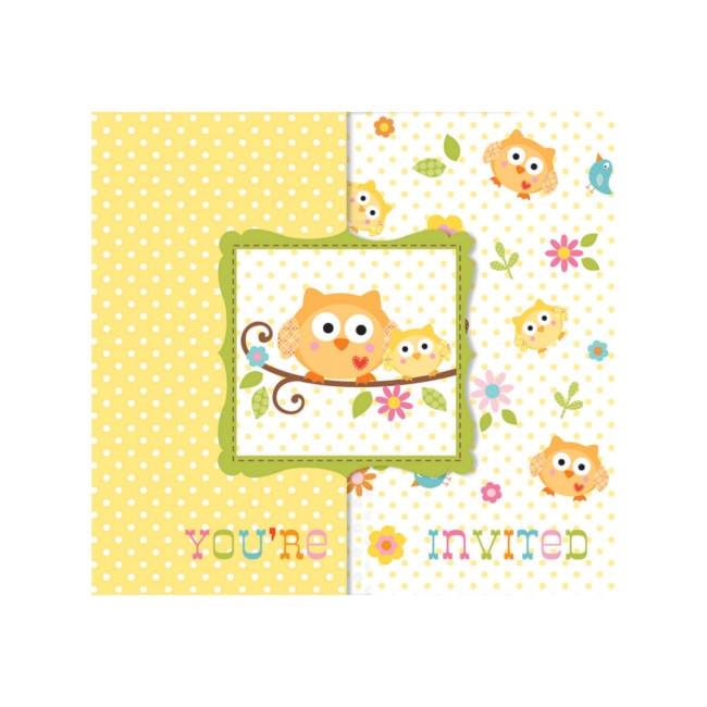 Set von 8 Eulen-Einladungen, alle in hellen Pastellfarben gestaltet.