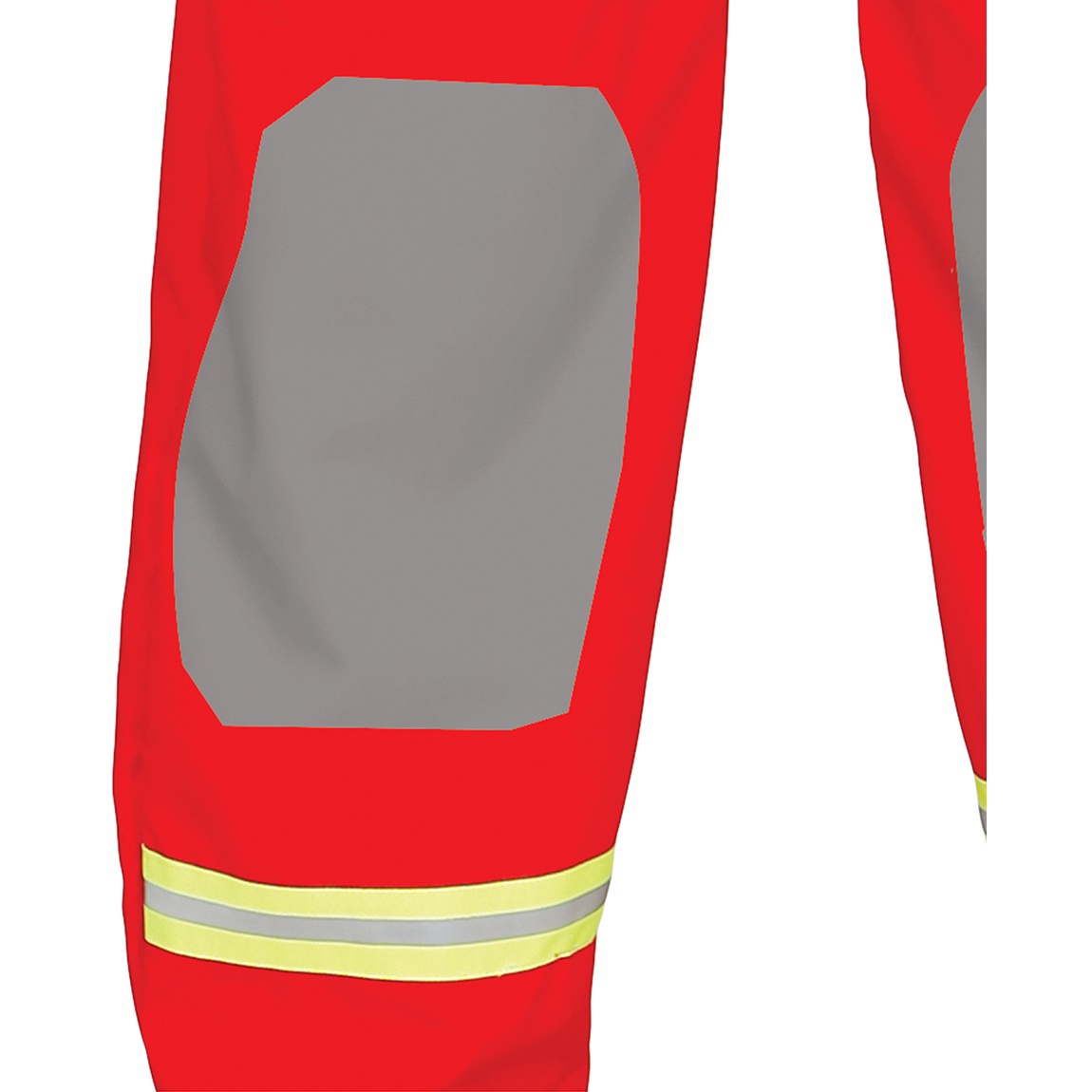 Es besteht aus einem Hut, der zur Jacke passt, die mit Klettverschlüssen geöffnet wird, und der Hose mit Gummibund an der Taille. Diese sind leuchtend rot mit reflektierenden Streifen auf der Vorderseite des Anzugs. Der Hut hat in der Mitte das Abzeichen der Feuerwehr und an den Knien gibt es graue Patches, die das Ganze origineller machen.
