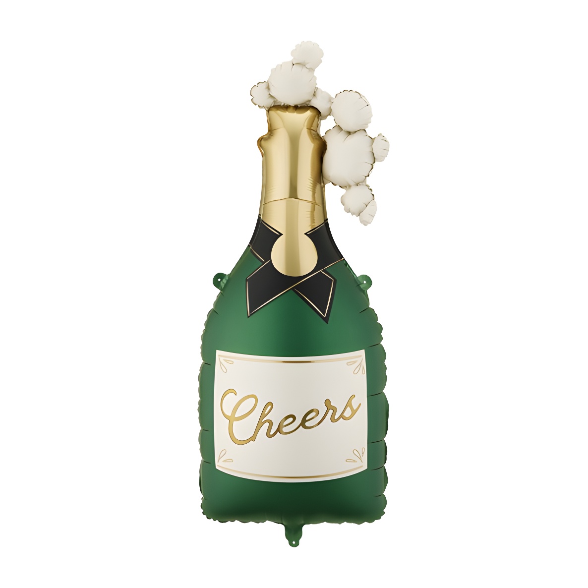 Folienballon in realistischer Champagnerflaschenform in Dunkelgrün mit der Aufschrift Cheers und Blasen-Details, die einen festlichen und eleganten Akzent setzen.