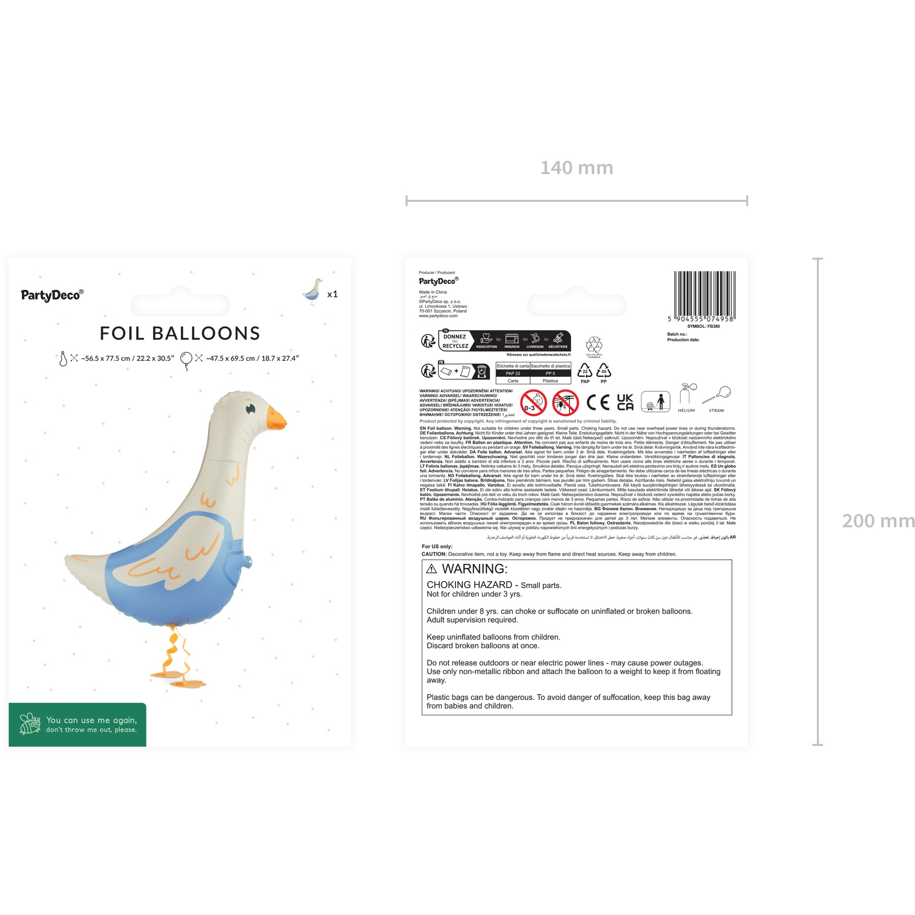 Foil-Gansballon mit Walking-Effekt in Offwhite mit hellblauer Hose - ideal, um Ihre Kindergeburtstage und -feiern liebevoll zu dekorieren. Mit Helium befüllt erzielt er den charakteristischen Bewegungseffekt.