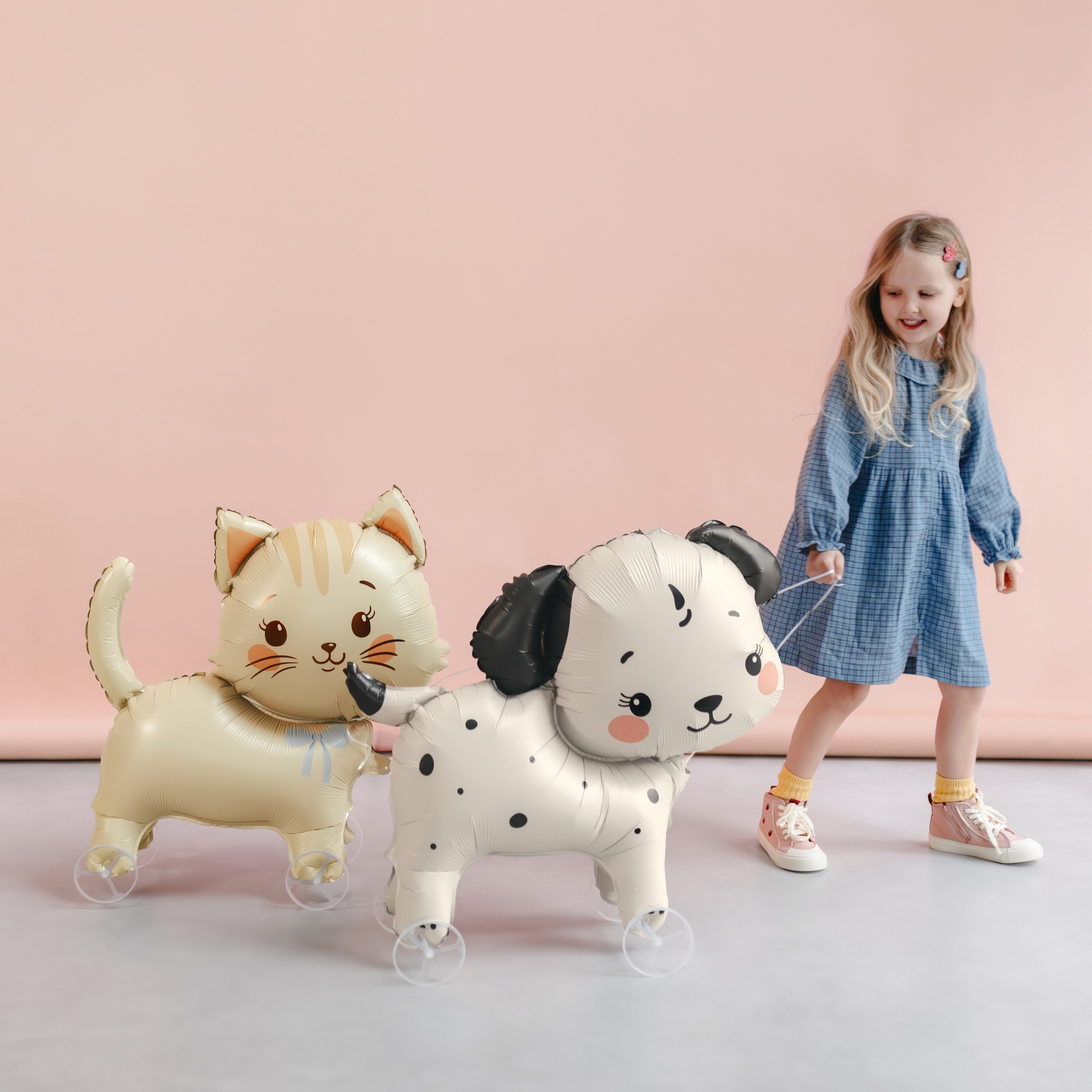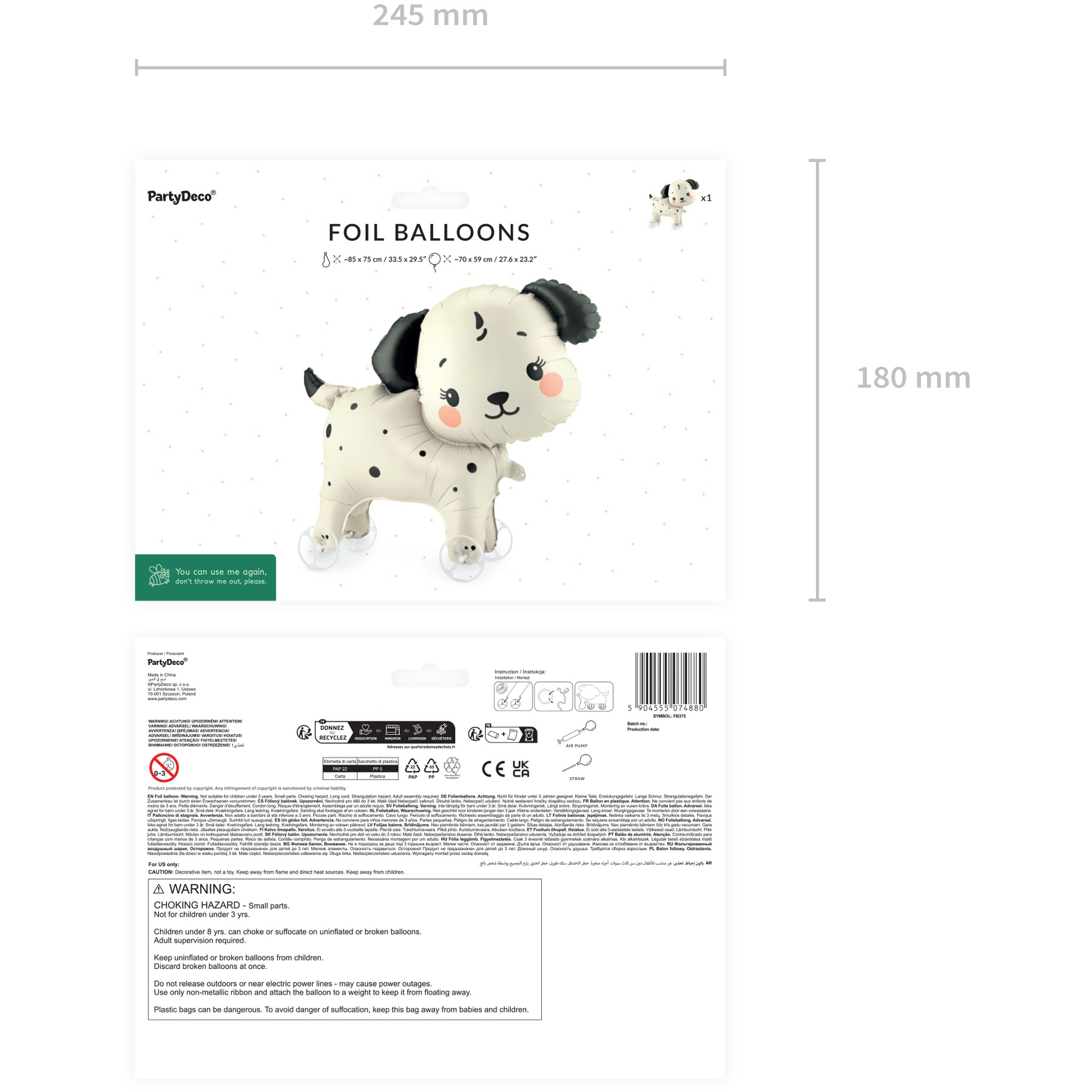 Folieballon in Hundeform mit Rollen in Beige- und Schwarztönen. Nach dem Aufblasen beträgt die Größe ca. 70 x 59 cm und sorgt als großformatiges Dekorationselement für starke visuelle Wirkung. Vor dem Aufblasen misst er etwa 85 x 75 cm. Sie blasen ihn ausschließlich mit Luft auf, was Montage und Präsentation vereinfacht. Die Rollen ermöglichen, dass sich der Ballon sanft über glatte Oberflächen bewegt und so für Bewegung und Spielspaß sorgt. Das niedliche, moderne Design ist ideal für Ihre Kinderdekorationen.