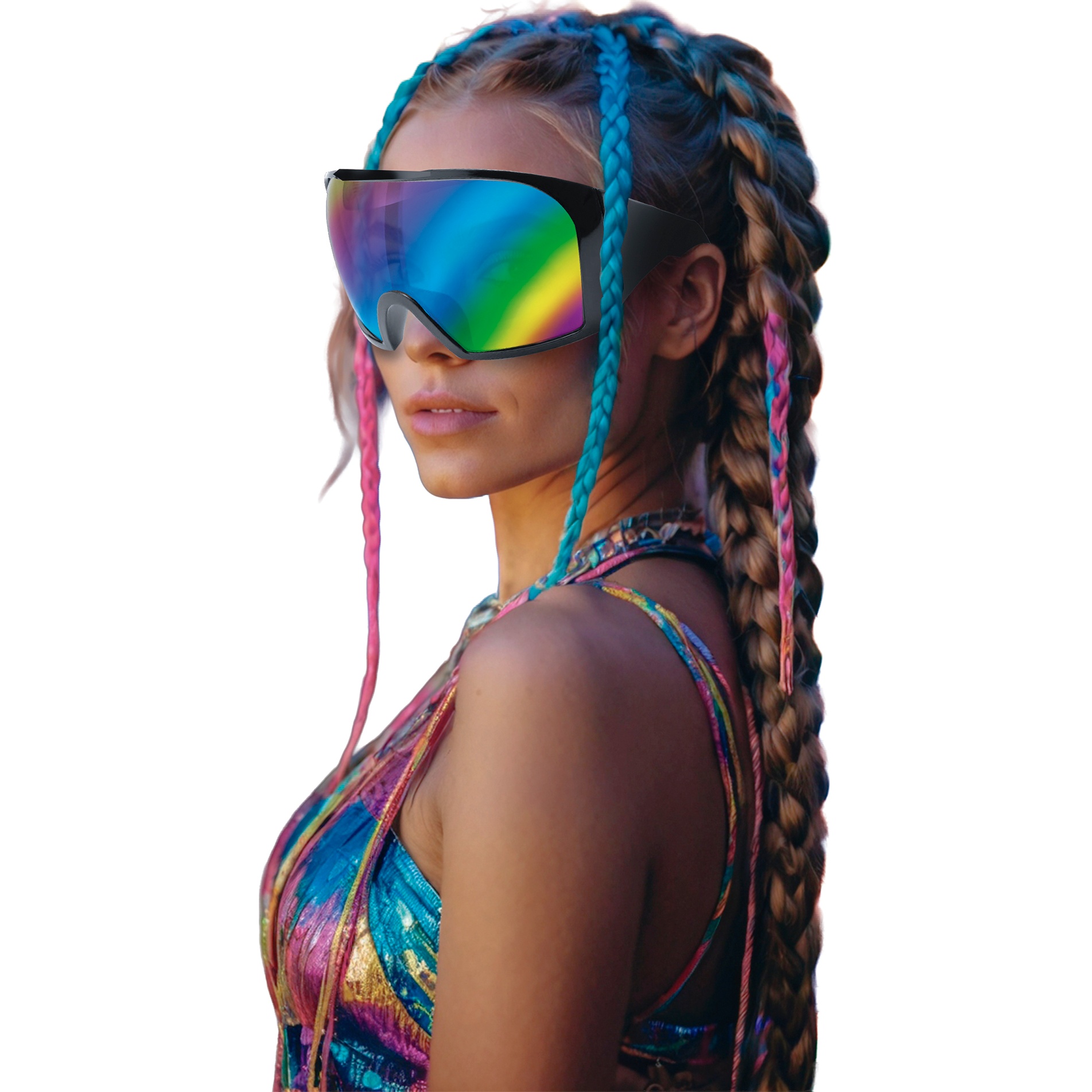 Diese futuristische Brille mit verspiegelter, mehrfarbiger Linse erzeugt eine starke visuelle Wirkung. Ihr panoramisches, geschwungenes Design verleiht Ihnen einen cyberinspirierten, modernen Look und setzt jedes kreative Outfit in Szene. Der leichte PVC-Rahmen und das breite Elastikband bieten Ihnen einen komfortablen, stabilen Sitz. Die reflektierende Linse verändert je nach Lichteinfall ihre Tönung und sorgt so für dynamische Effekte bei Fotos und Shows. Ein Statement-Accessoire, mit dem Sie bei Events, Fotoshootings und markanten Looks hervorstechen.