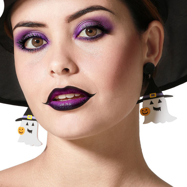 • Ein Paar Ohrringe in Form von weißen Geistern mit schwarzen Details. Fröhliches und thematisches Design.