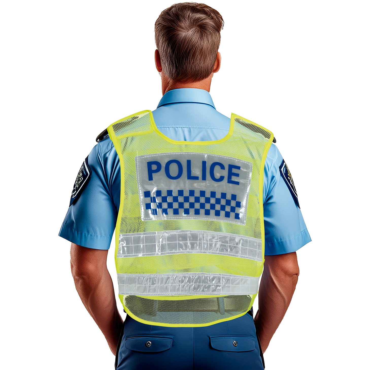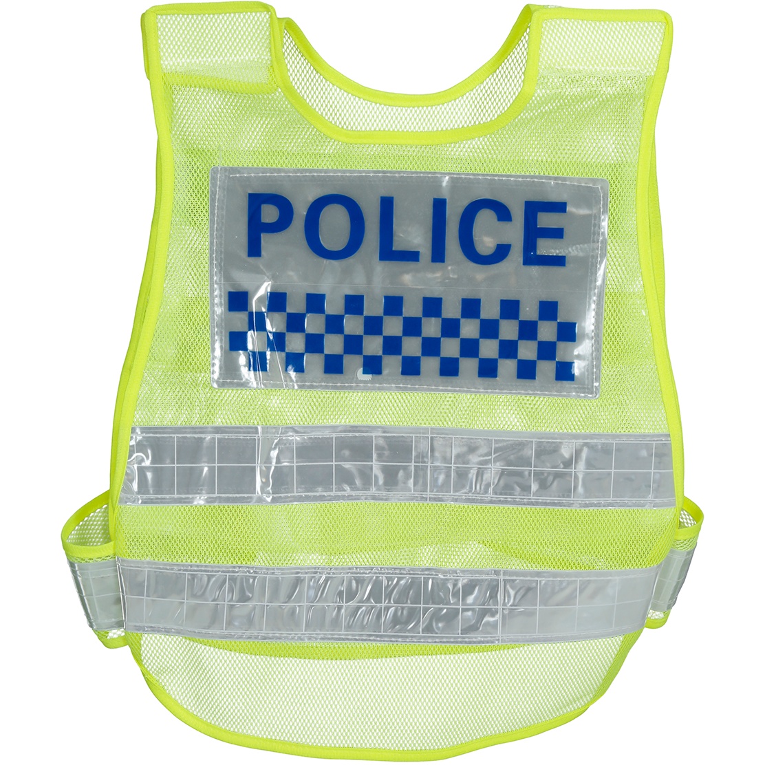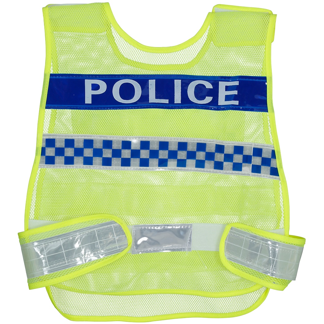 • Realistisches Erscheinungsbild mit der Aufschrift "POLICE" und Schachbrettstreifen, die an offizielle Westen erinnern.