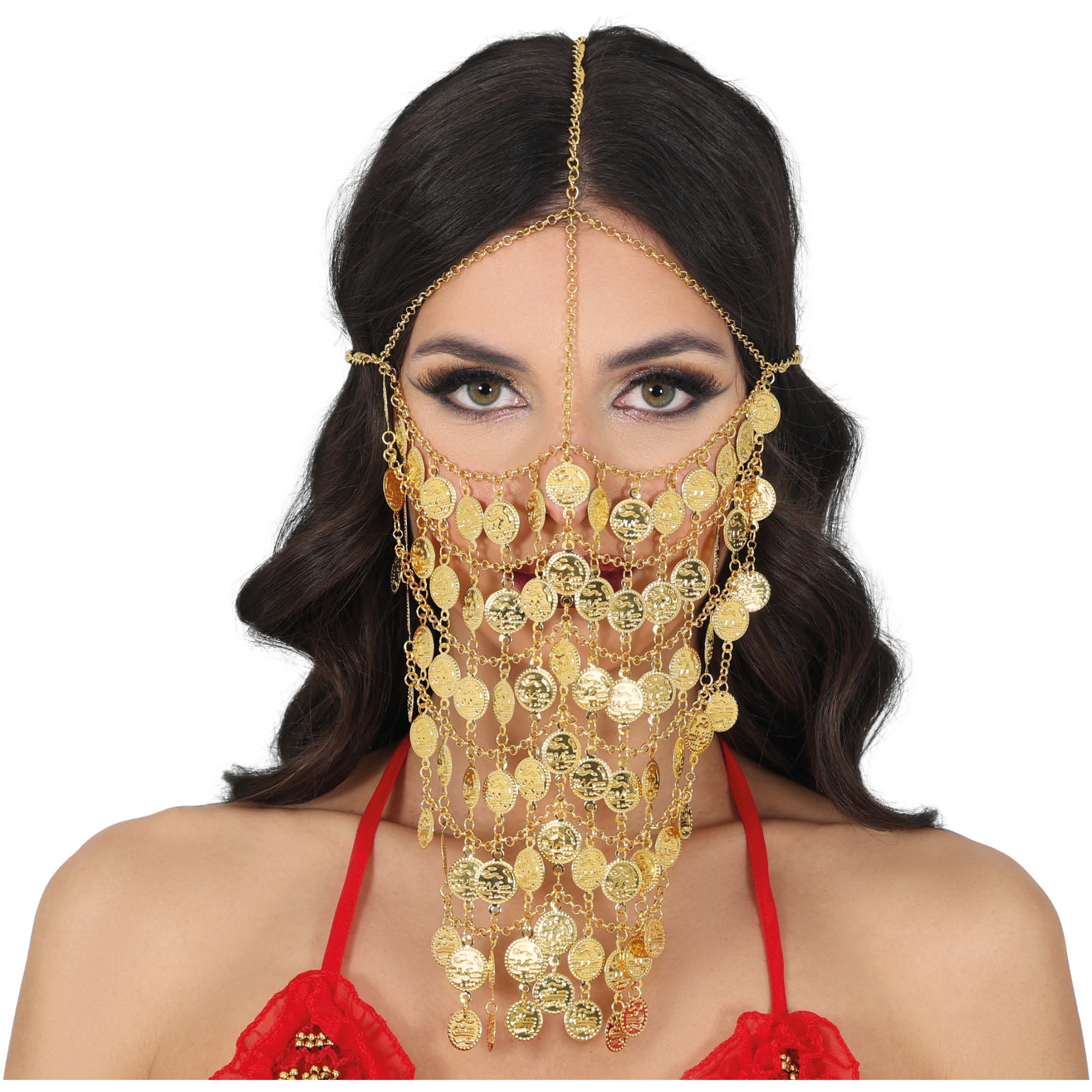 Auffälliges Accessoire, das Glanz, Bewegung und Rhythmus in Ihre Auftritte bringt. Aus goldfarbenen Ketten mit zahlreichen hängenden Münzen, die beim Bewegen Klang erzeugen und die Bühnenpräsenz unterstreichen. Sie lässt sich mit seitlichen und oberen Ketten anbringen und bietet so stabilen und bequemen Halt beim Tanzen. Ideal für Bauchtanz, Shows, Fotoshootings und Karneval - für einen markanten, orientalischen Look, der besonders bei erwachsenen Trägern Eleganz und Spektakel vereint.
