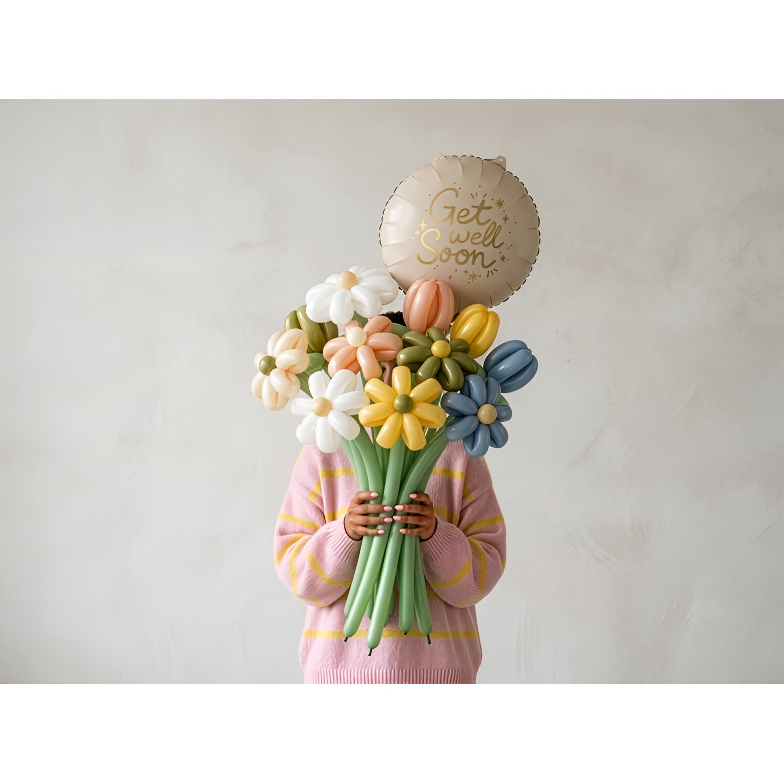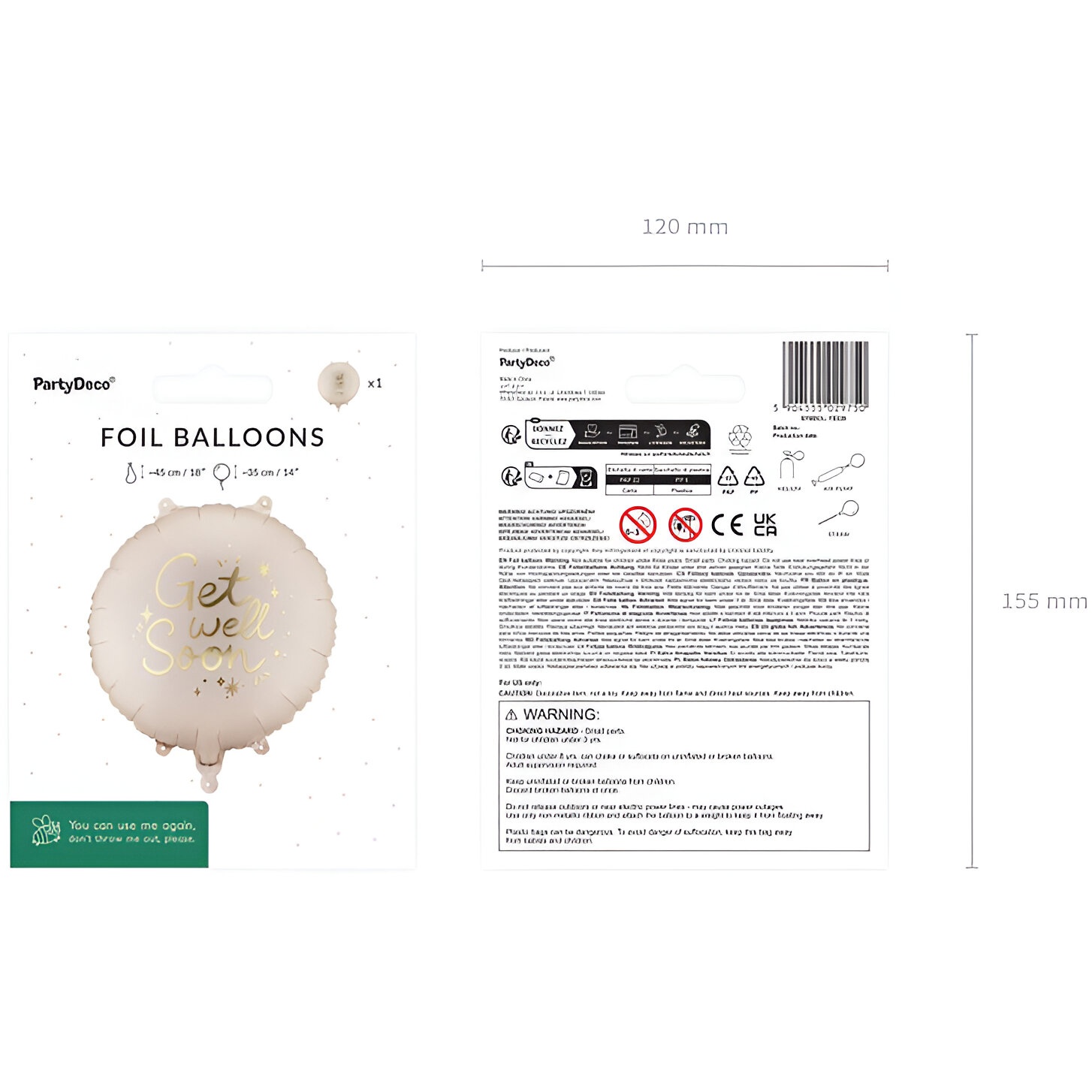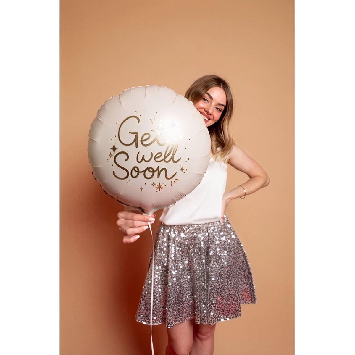 Runder Folienballon mit der beruhigenden Aufschrift "Get Well Soon" in elegantem Gold auf beigem Hintergrund. Ideal als kleines Mitbringsel bei Besuchen oder als Geschenk zur Genesung - er verleiht Ihrer Aufmerksamkeit eine elegante, herzliche Note. Kann mit Luft oder Helium aufgeblasen werden und behält dank des Folienmaterials seine Form. Größe nach dem Aufblasen: ca. 35 x 35 cm.