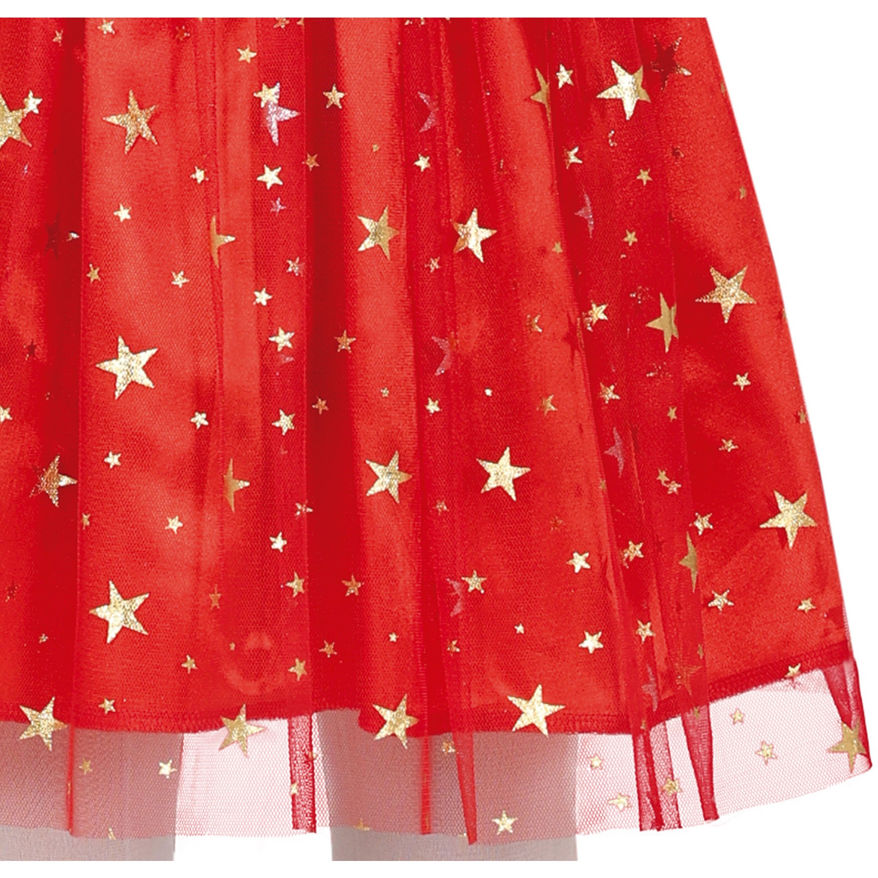 Ein wunderschönes Mama Noel-Kostüm, bestehend aus einem Kleid mit Tüllstoff und Sternen als Verzierung.