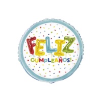 Runder Metallic-Ballon mit einem lustigen roten Design und einem bunten Sternenhintergrund. Ideal für den Einsatz bei Geburtstagsfeiern und wird beidseitig bedruckt.