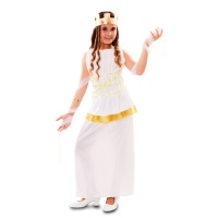 Kostüm einer Bürgerin des antiken römischen Reiches. Es besteht aus einer weißen Tunika in Form eines langen Kleides mit V-Ausschnitt und einem senffarbenen Umhang. Es hat schöne goldene Verzierungen am Halsausschnitt und am unteren Ende des Rocks sowie goldene Reifen an den Schulterriemen. Unterhalb der Brust und an einem der Ränder des Umhangs befindet sich ein Band mit geometrischen Motiven in Gold.