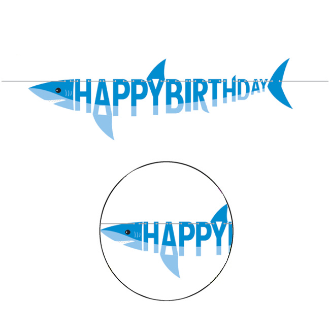Das Design dieses Happy-Birthday-Streifens mit Happy-Birthday-Schild ist sehr originell, da er die Silhouette eines Hais zeigt. Er passt hervorragend zu der gleichen thematischen Dekoration, die ebenfalls auf unserer Website erhältlich ist.