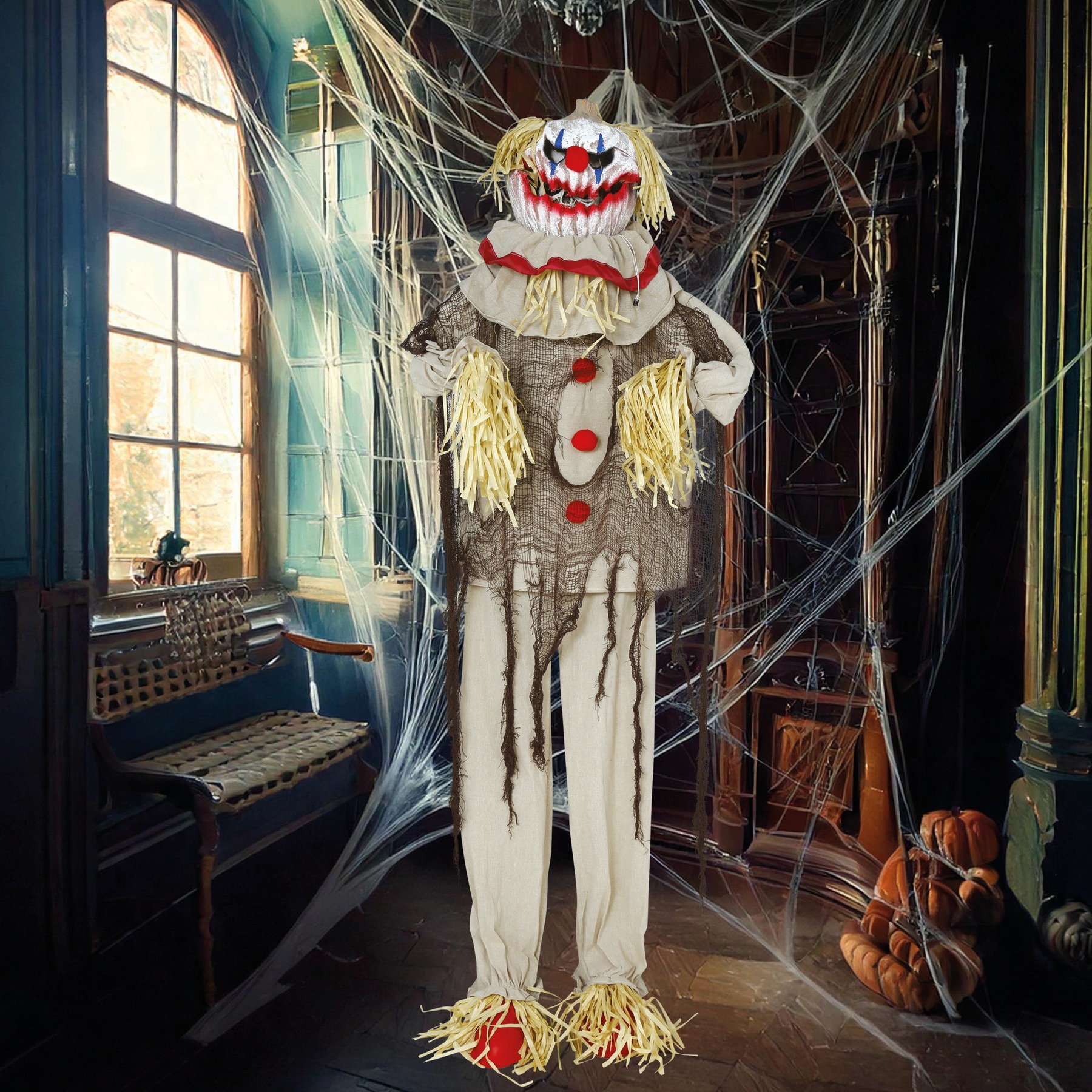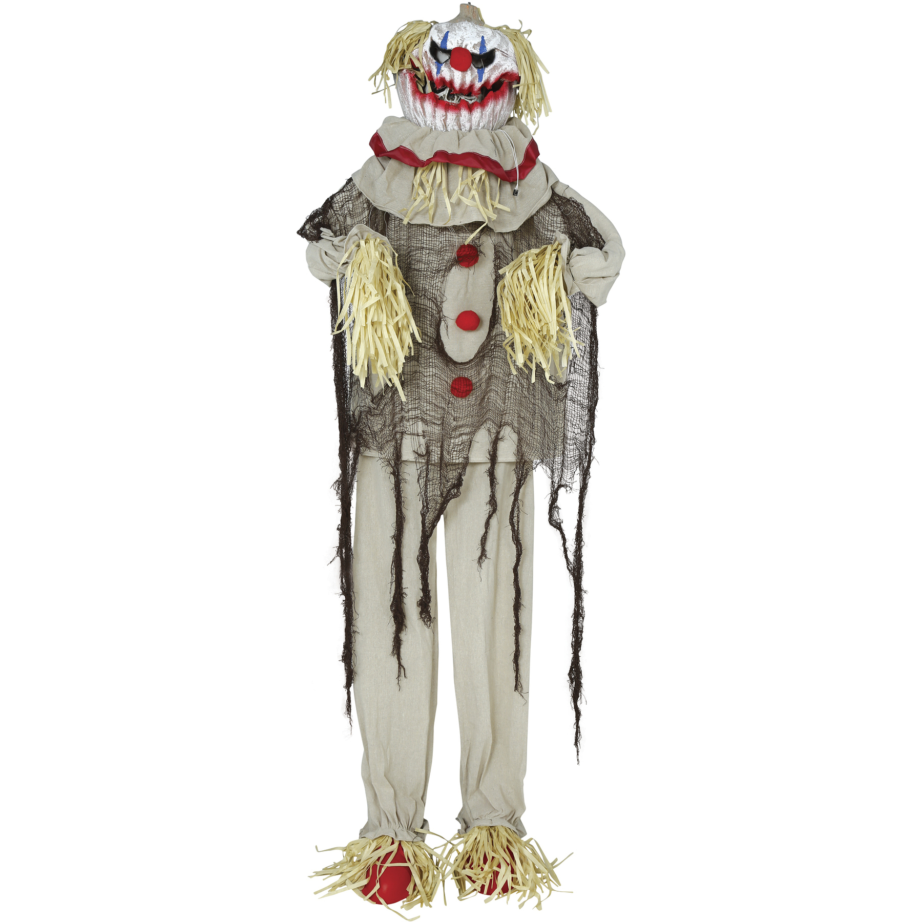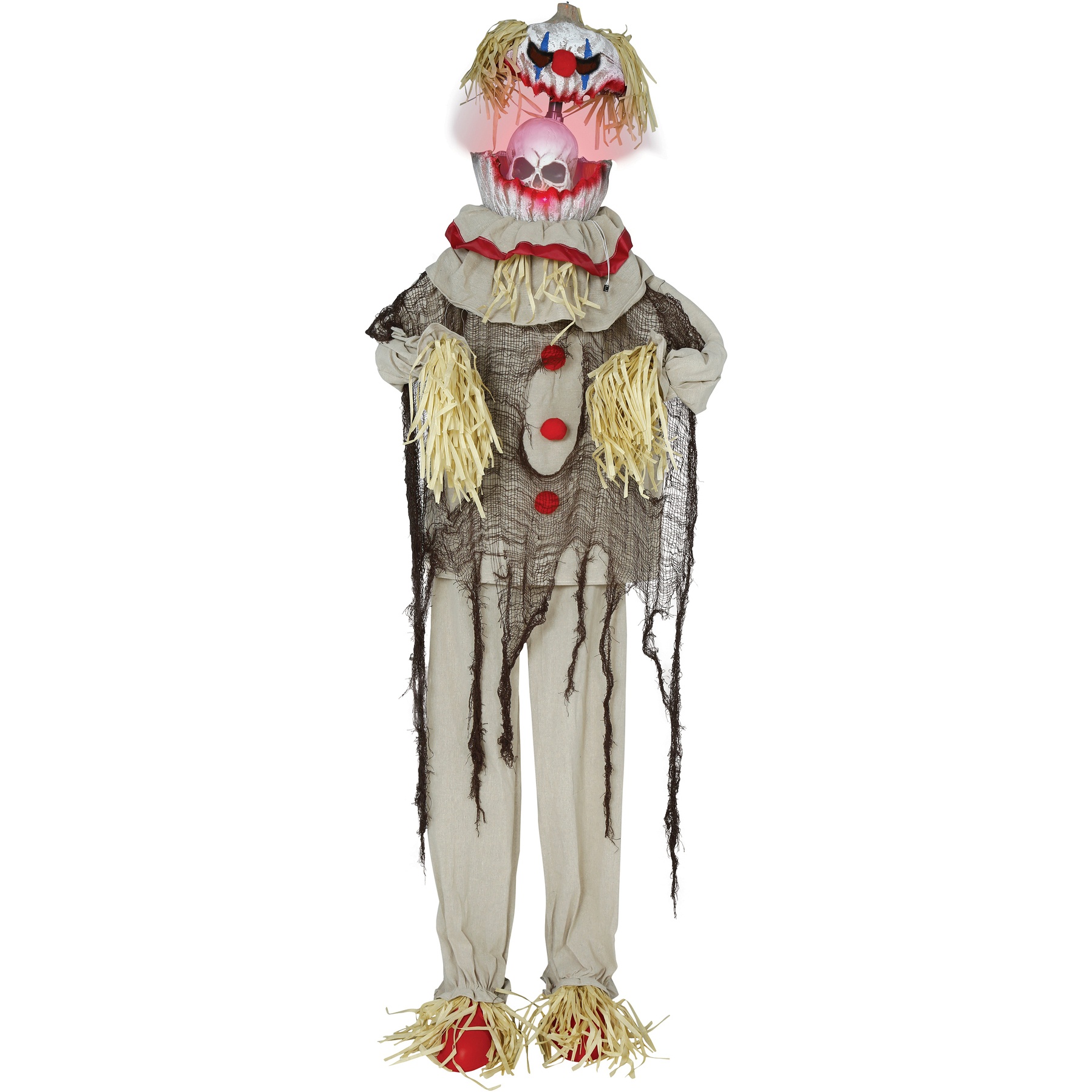 Gruselige Vogelscheuche-Clownfigur mit Licht, Ton und Bewegung, 1,75 m