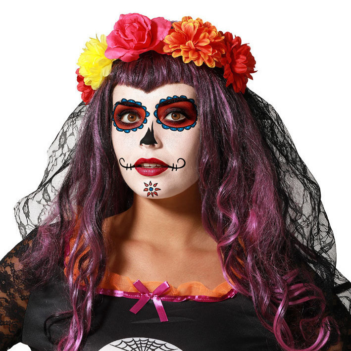 Haarband mit bunten Blumen und Catrina-Schleier